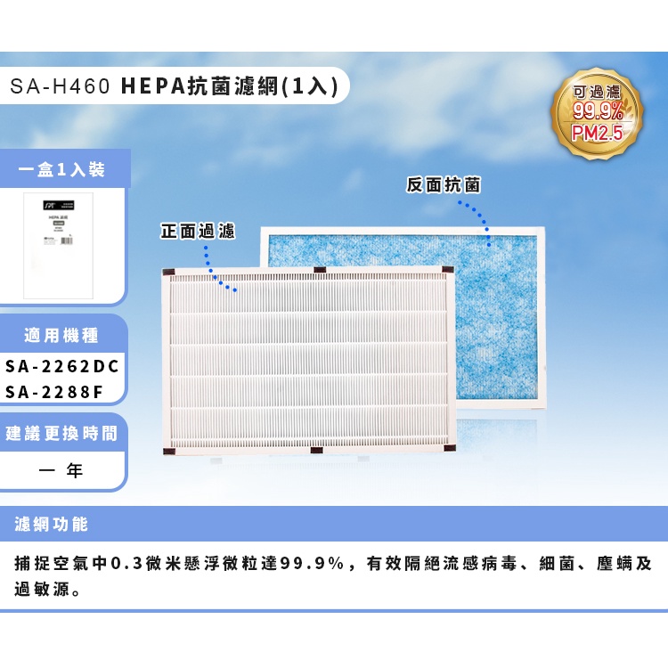 【尚朋堂】空氣清靜機SA-2262DC/SA-2288F專用強效HEPA濾網SA-H460