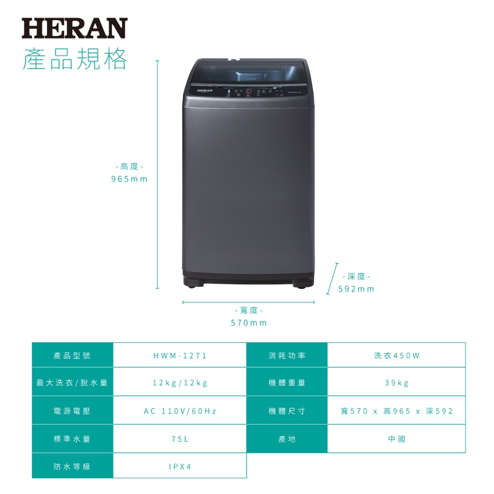 【禾聯 HERAN】極致窄身12公斤超潔淨 直立式 定頻 洗衣機 HWM-1271 (2022新機上市)