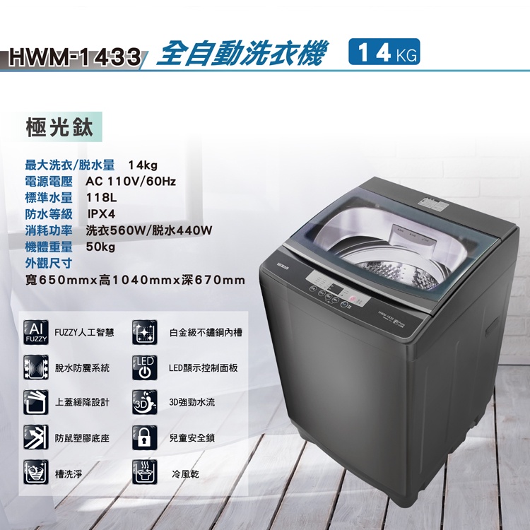【禾聯 HERAN】 HWM-1433 14KG全自動洗衣機 (極光鈦 強勁系列)-升級款