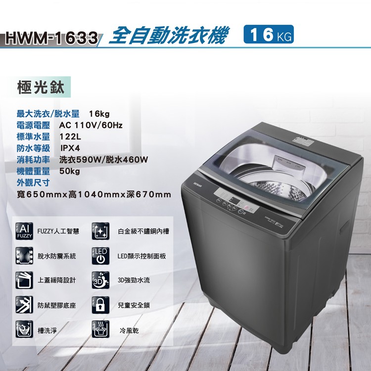 【禾聯 HERAN】 16KG 定頻直立式洗衣機 HWM-1633含基本安裝 免樓層費