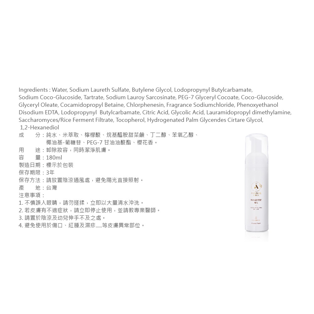 [台灣穀堡]AVENUE 艾馥洣 米的洗卸慕斯 櫻花 180ml 洗臉 潔顏泡沫 卸妝 洗面乳 臉部清潔 保濕