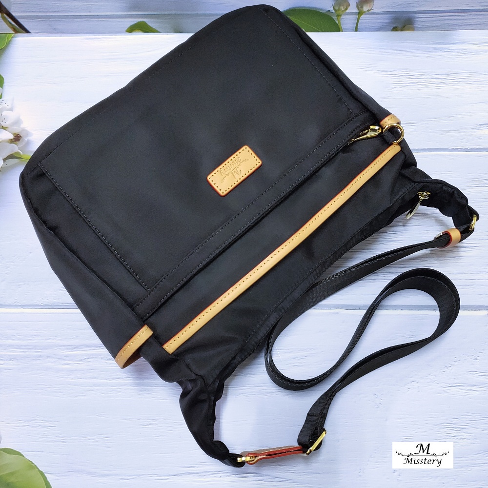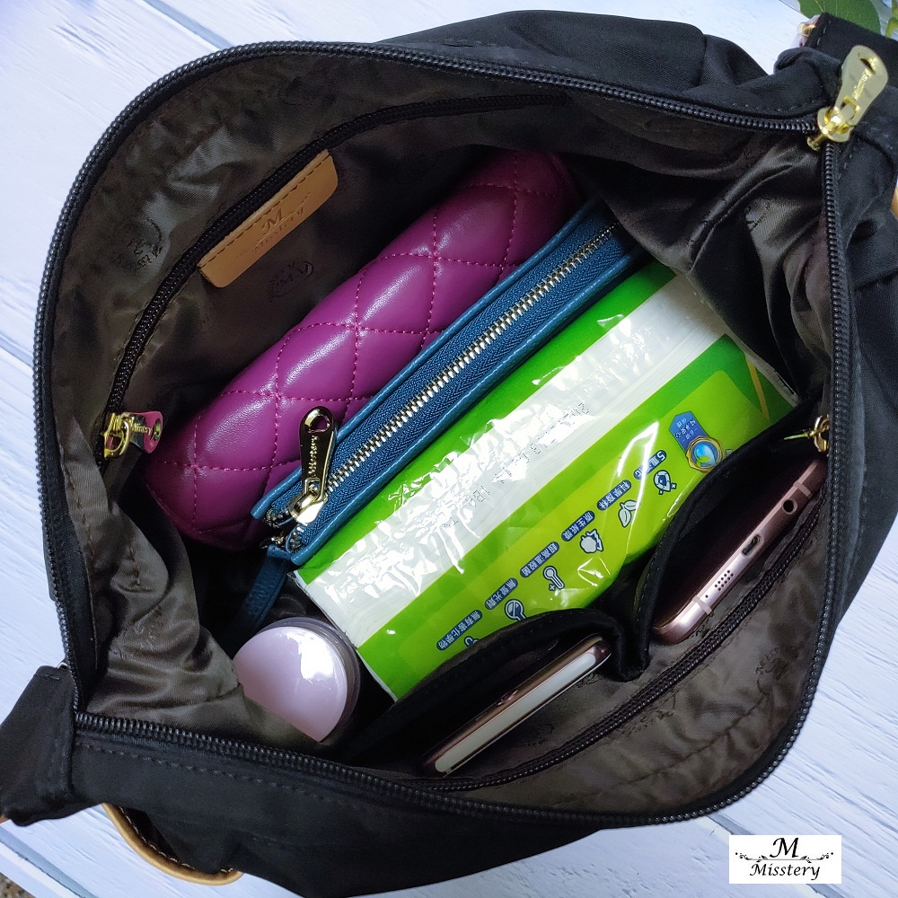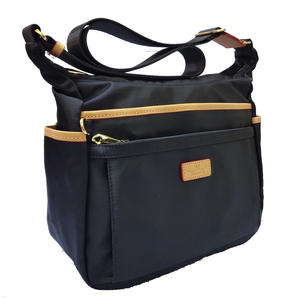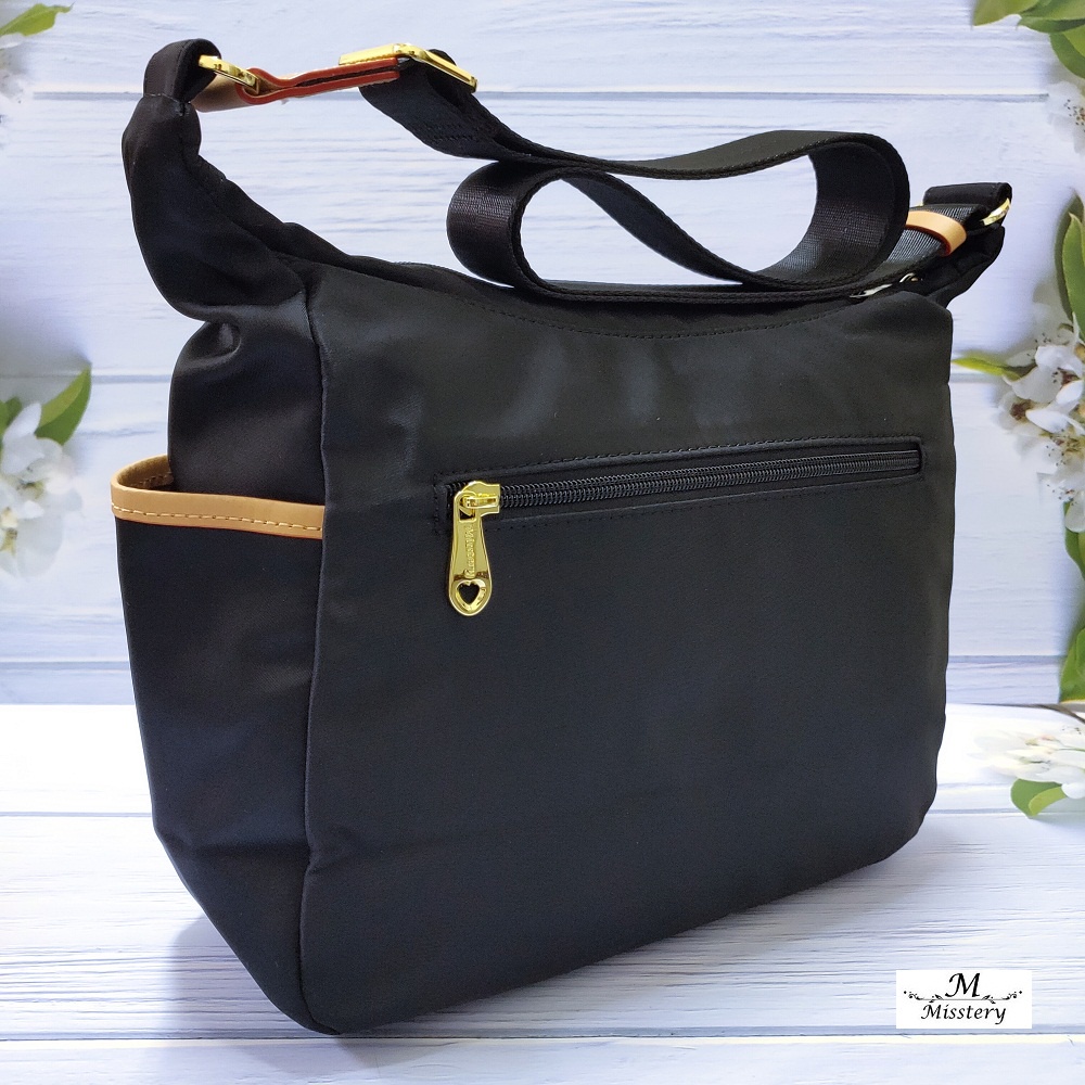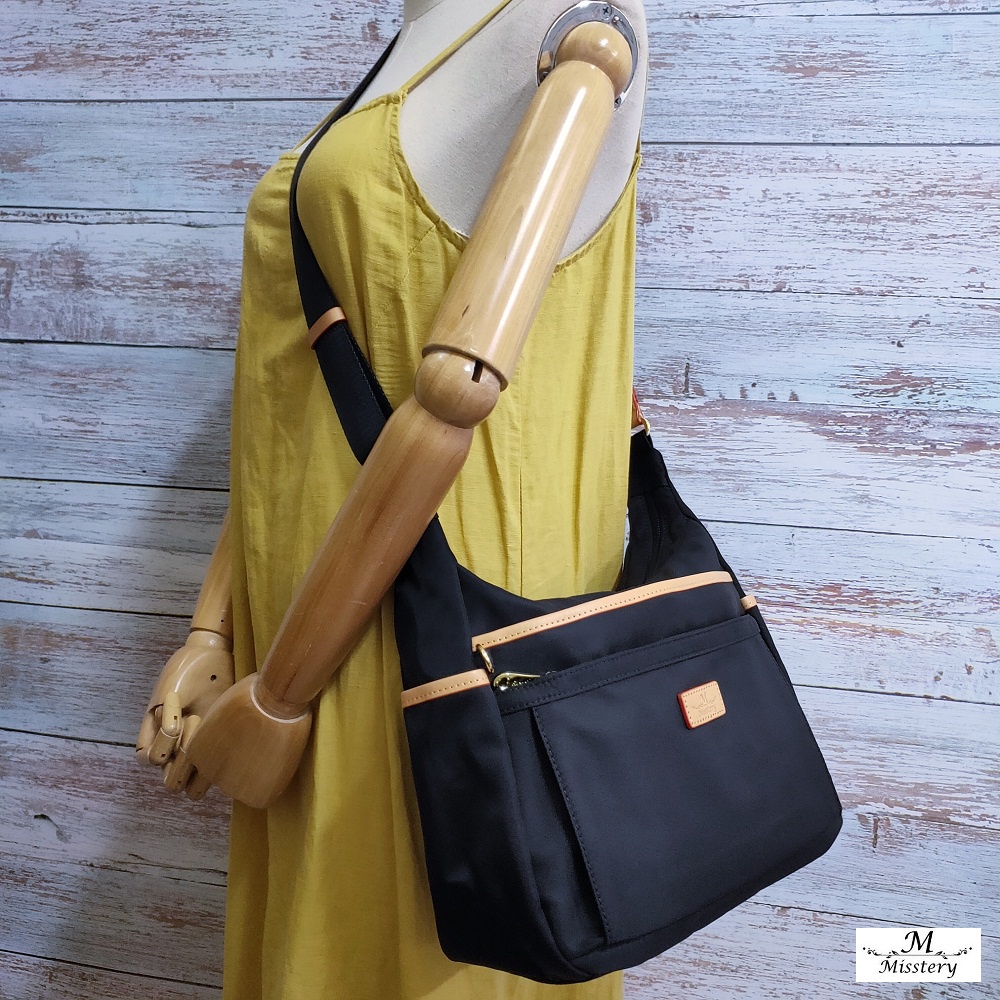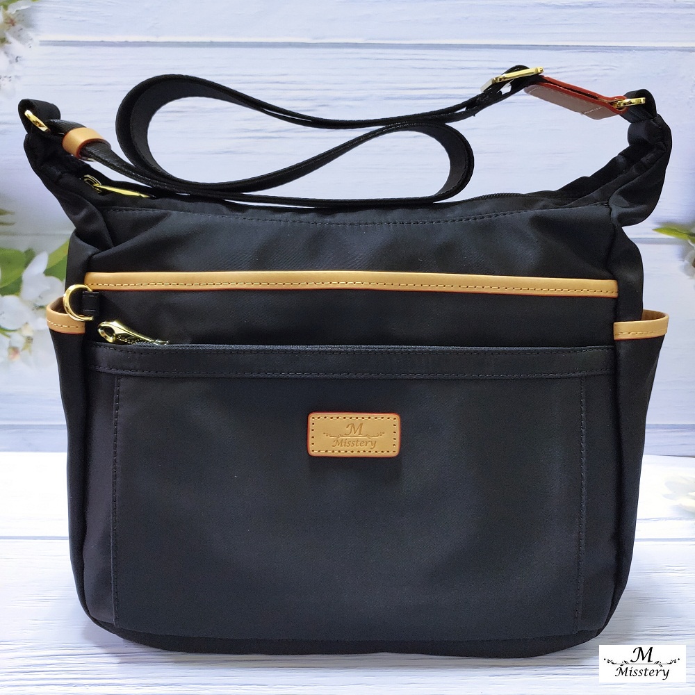 【Misstery】側肩背台灣防潑水面料搭配頂級植鞣革肩背包-黑A88-057BK