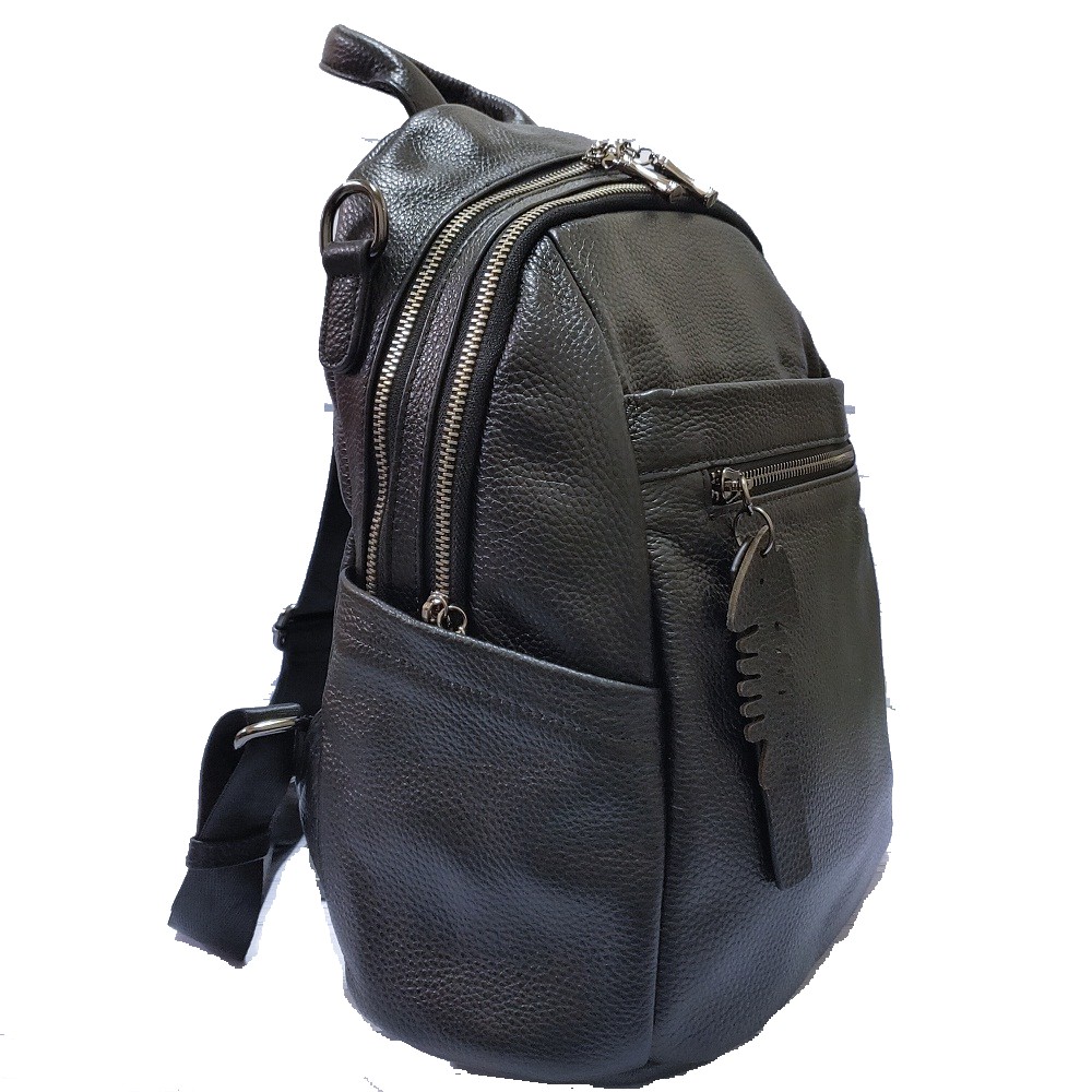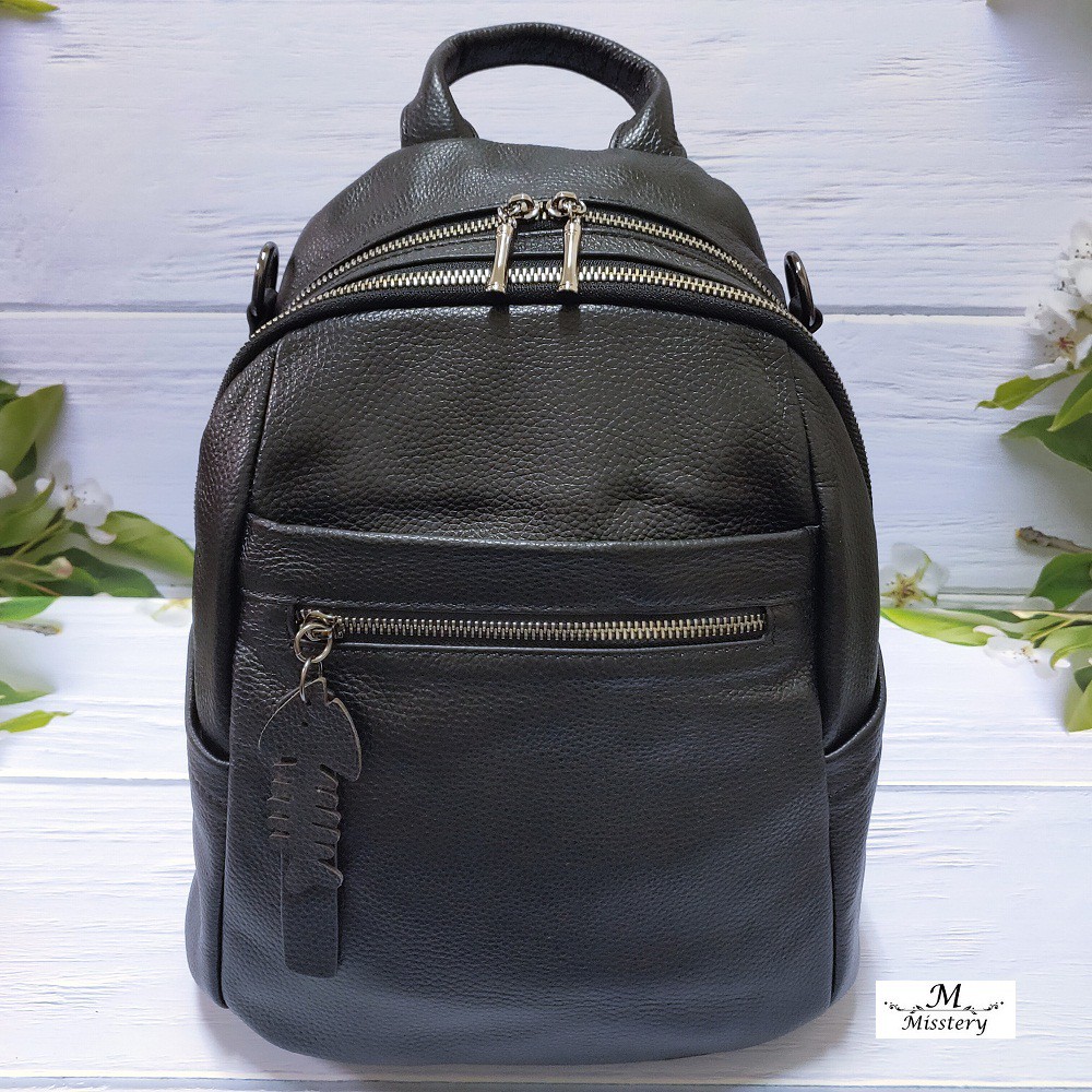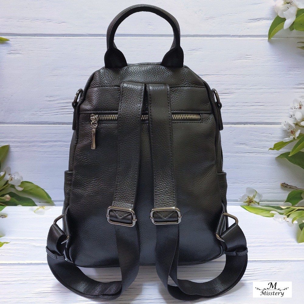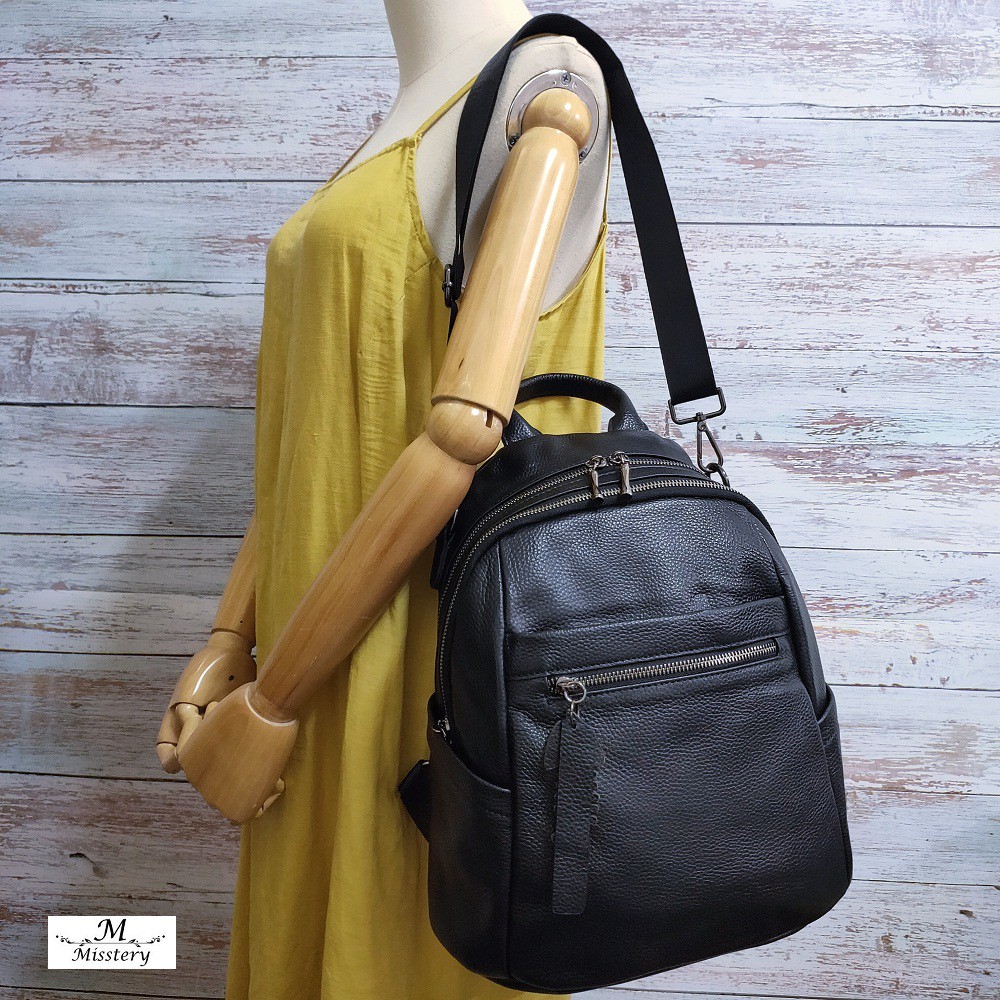 【Misstery】後背包進口牛皮時尚前拉鏈肩背帶後背包-黑(A88-162BK)