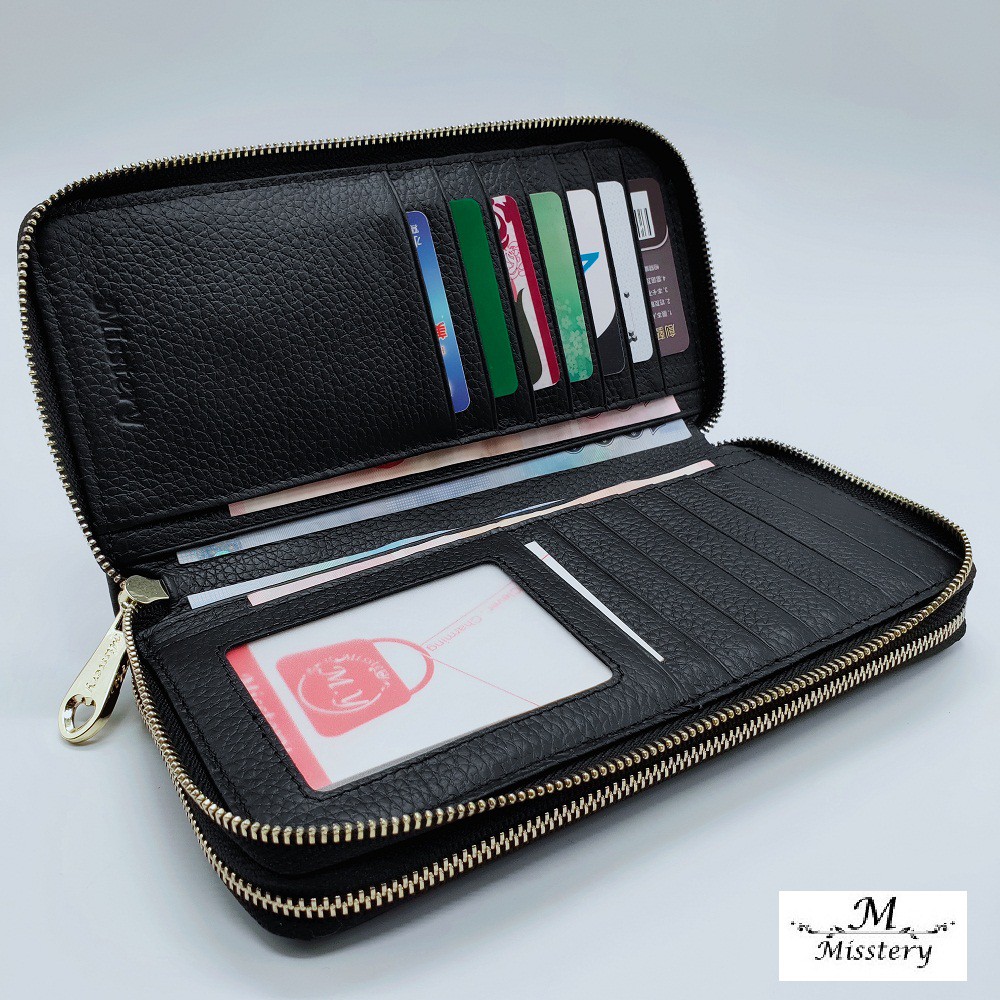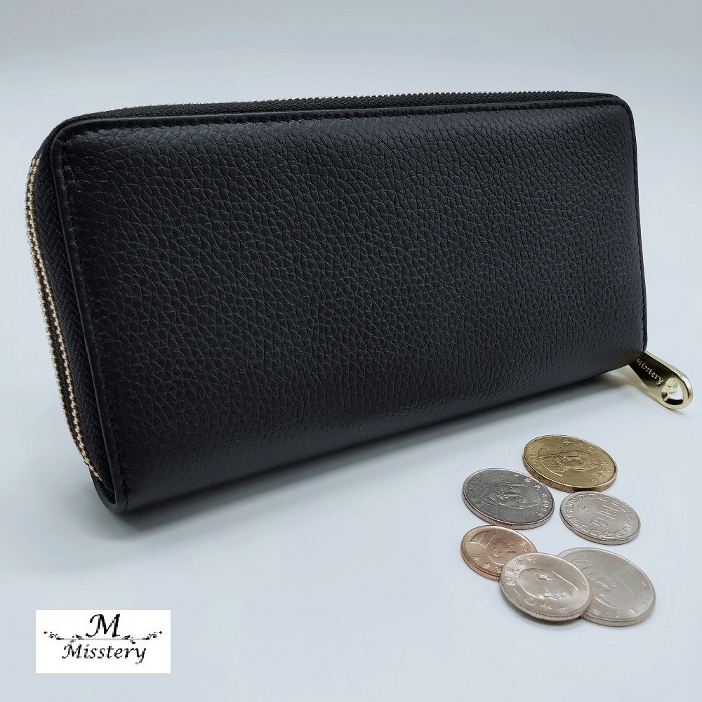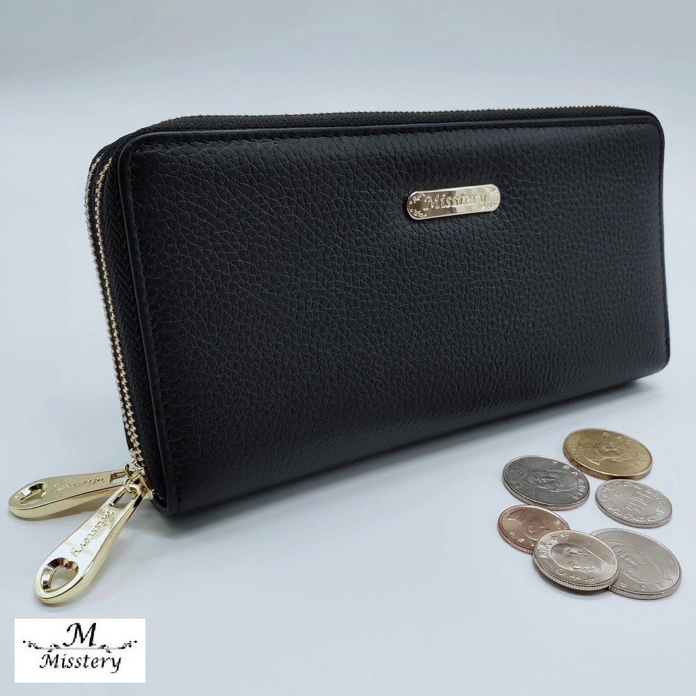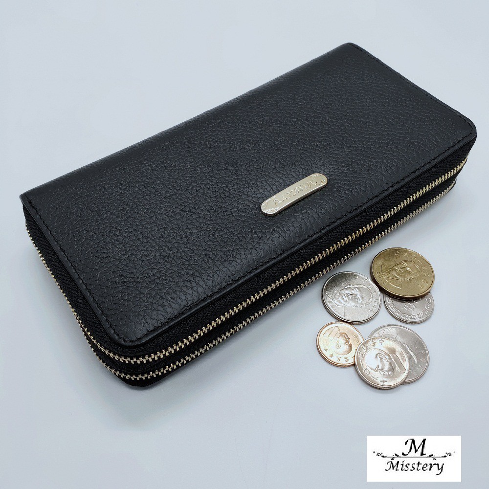 【Misstery】長夾進口牛皮雙層拉鍊女用長夾-黑 A99-808BK