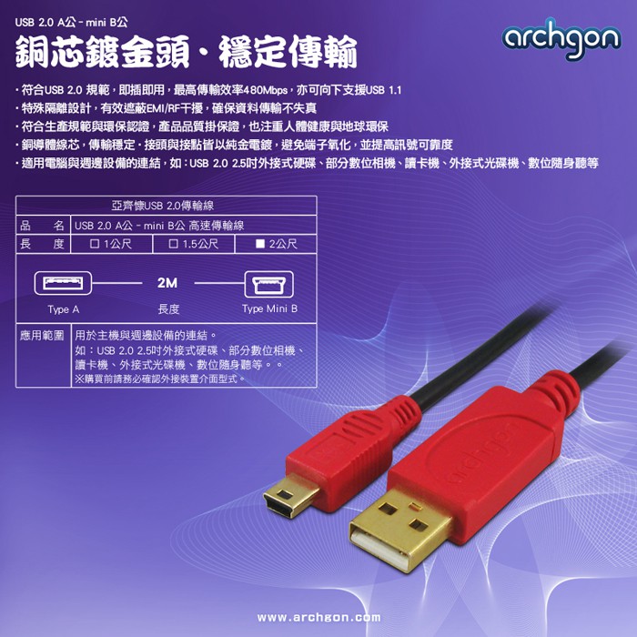 archgon USB2.0 Type A to Mini B 高速傳輸線、電腦線材、3C線材