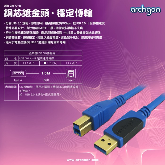 archgon USB3.0 Type A to Type B 高速傳輸線、電腦線材、3C 線材