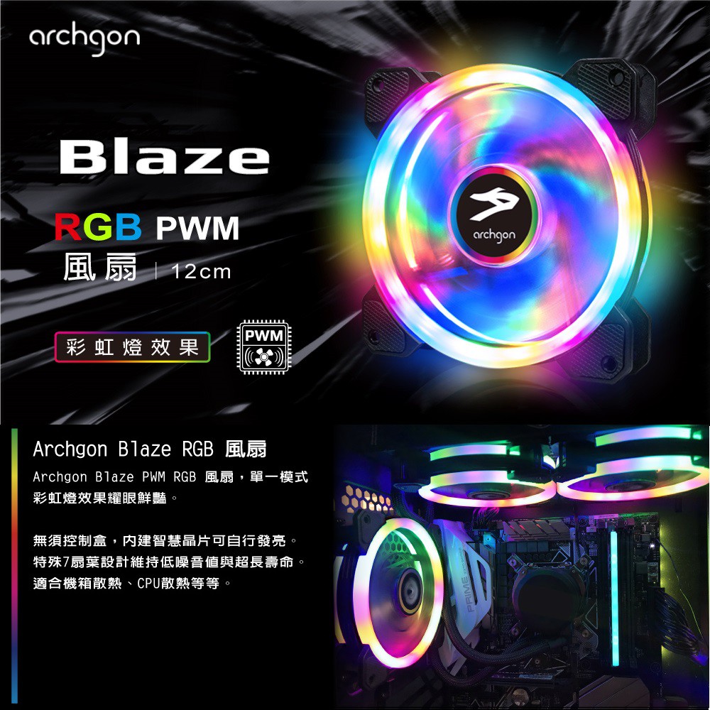 Archgon Blaze PWM RGB電競風扇 電腦風扇 RGB風扇 散熱器-彩虹燈 (單入) (RGBSF02)