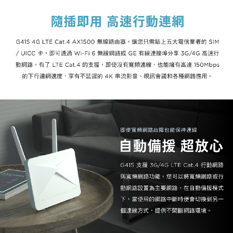 D-LINK G415 4G 無線路由器 MIT 台灣設計製造 LTE AX1500 無線分享 網路分享器 DL028