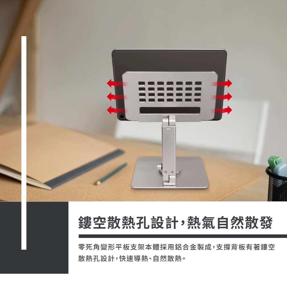 零死角變形平板支架 鋁合金桌面立架 (雙輪軸可調角度/高低升降/鏤空散熱孔/摺疊收納)