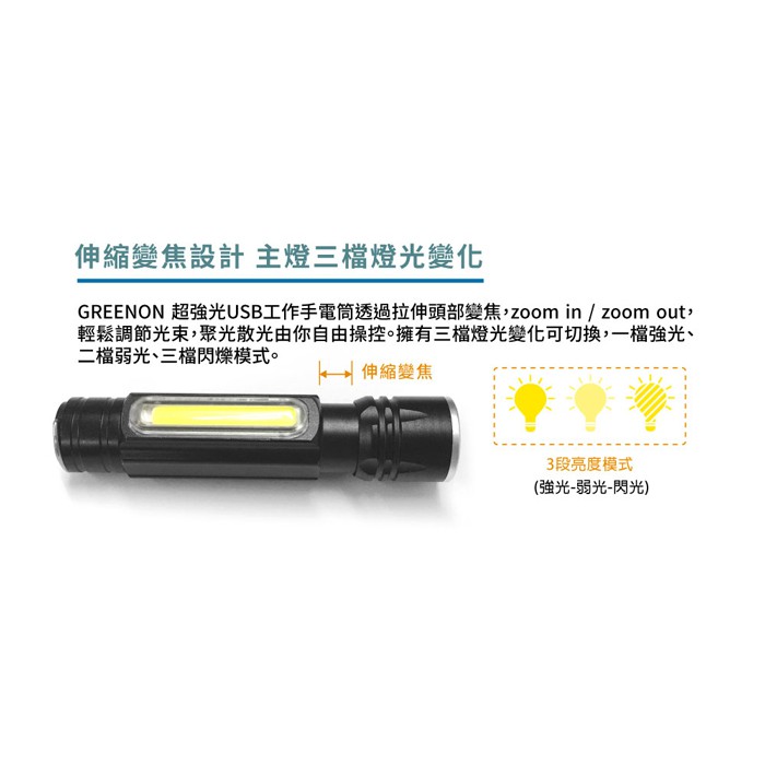 【GREENON】超強光USB工作手電筒 伸縮變焦 USB充電 防水等級IPX6 T6超強光燈珠