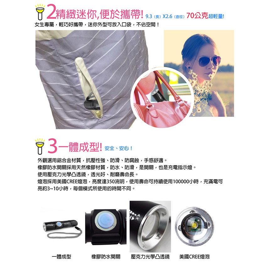 【Greenon】強光USB充電手電筒 精緻迷你,小資女專屬