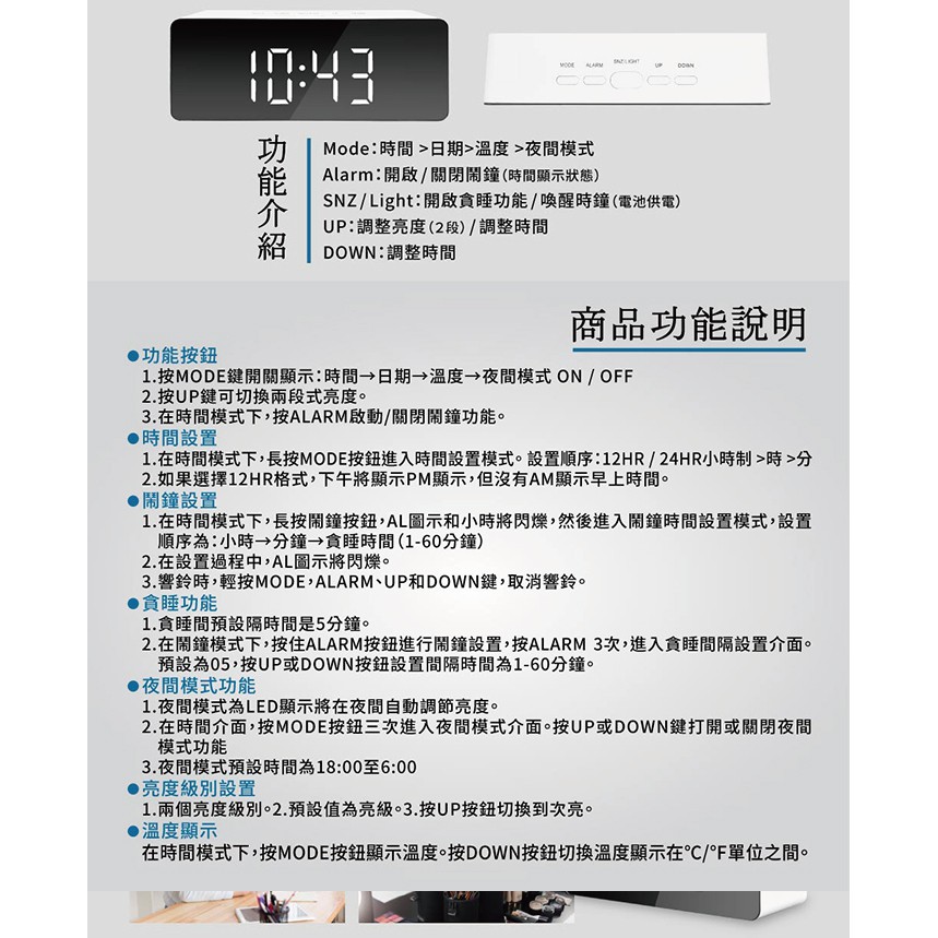 LED鏡面時鐘 鬧鐘 化妝鏡 溫度日期顯示多功能合一