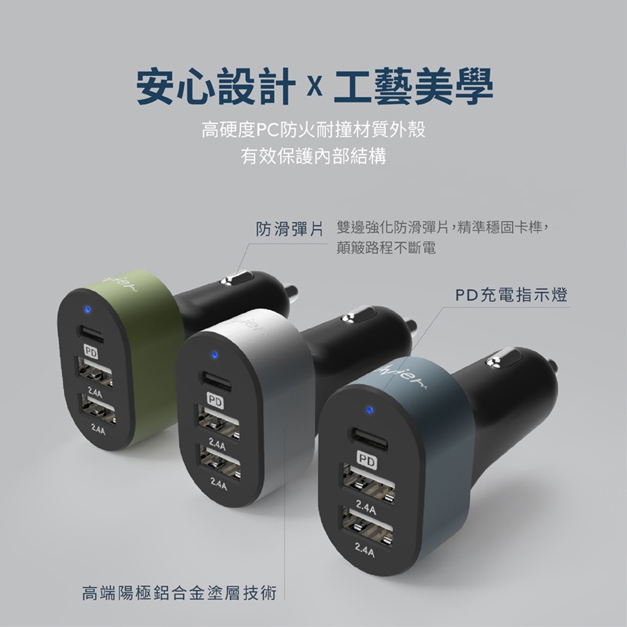 【Avier】COLOR MIX 42W 智能 三孔 車用充電器 快充 Type-C 孔 USB 孔 - 湛礦藍
