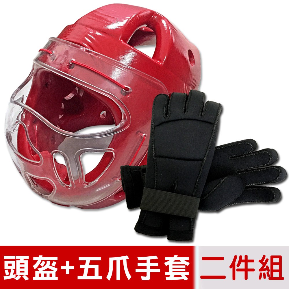 【輝武】嚴選-全包式護頭面罩頭盔+五爪分離招式技擊手套二件組-紅(尺寸可選)