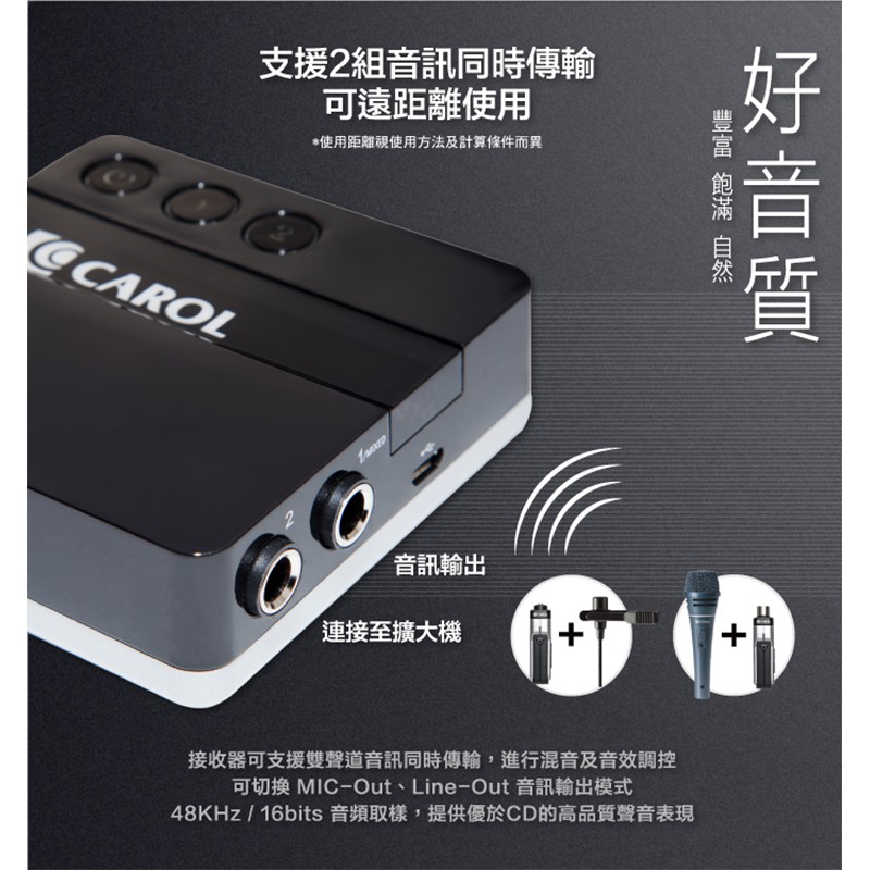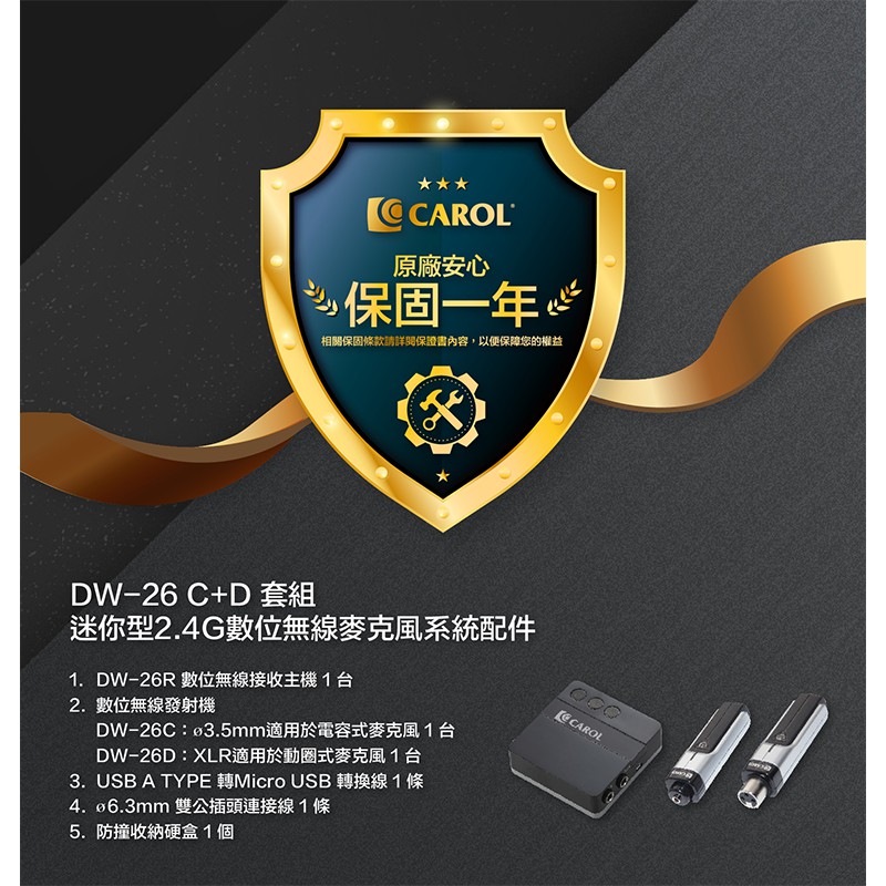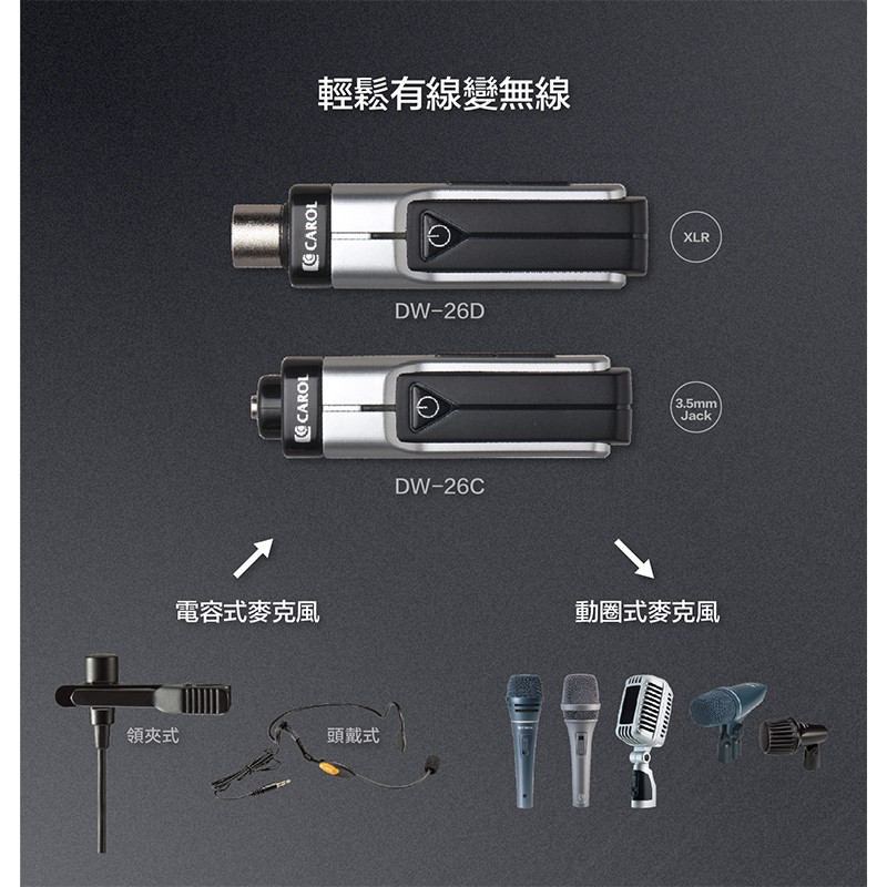 【CAROL】輕巧掌上型2.4G數位無線麥克風系統 DW-26 C+D (支援電容、動圈麥克風)