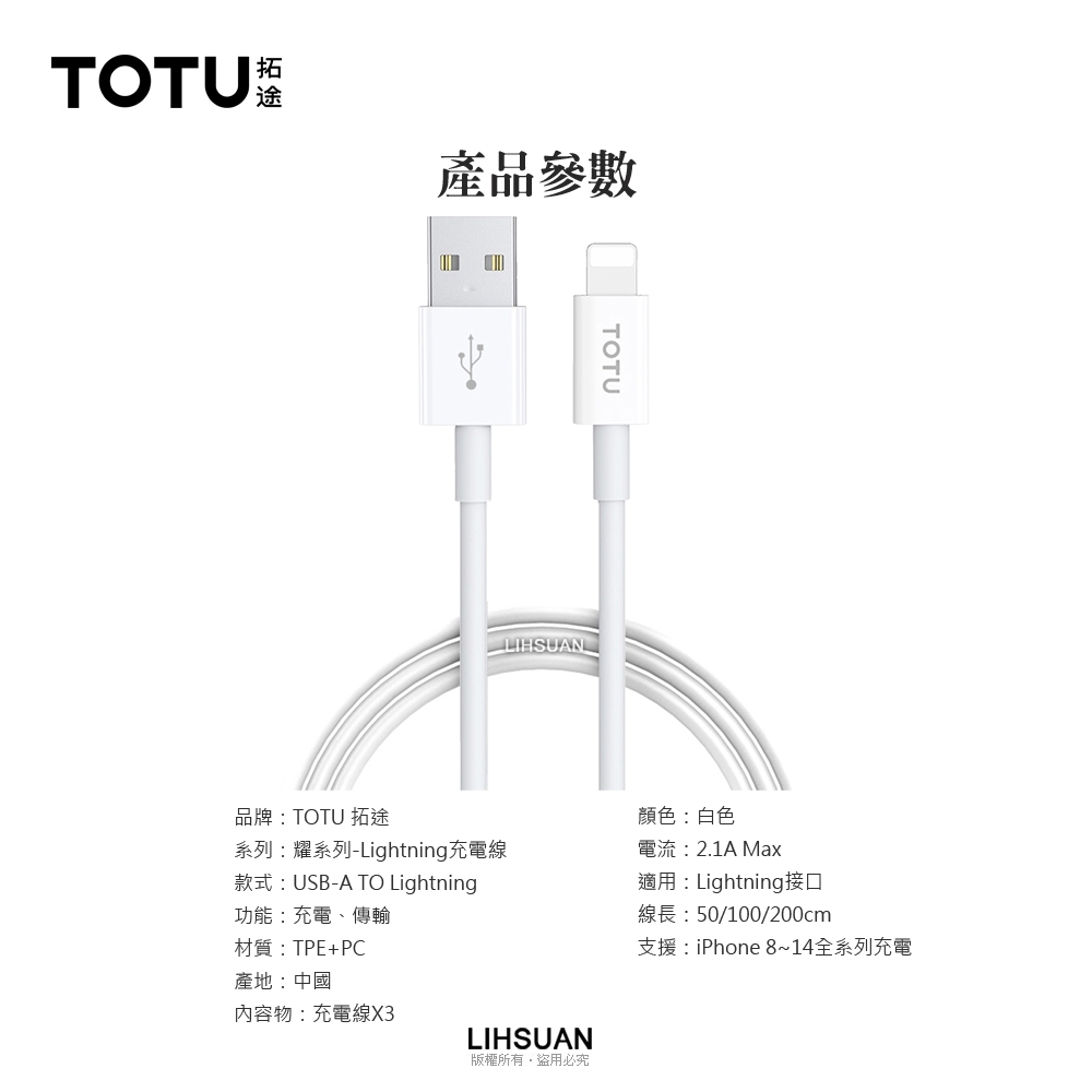 TOTU iPhone/Lightning 2.1A 快充充電傳輸線 (三入) 50/100/200cm