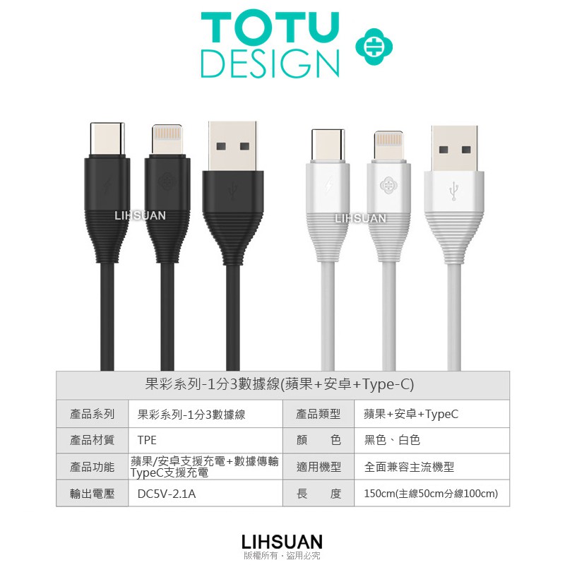 TOTU iPhone/Lightning/安卓Micro/Type-C充電線 2.1A快充 果彩系列