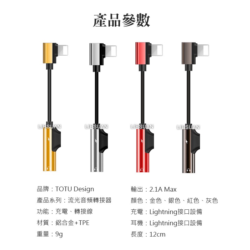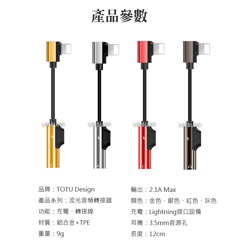 TOTU Lightning/iPhone轉接頭轉接線音頻轉接器 3.5mm 聽歌充電 彎頭 流光系列