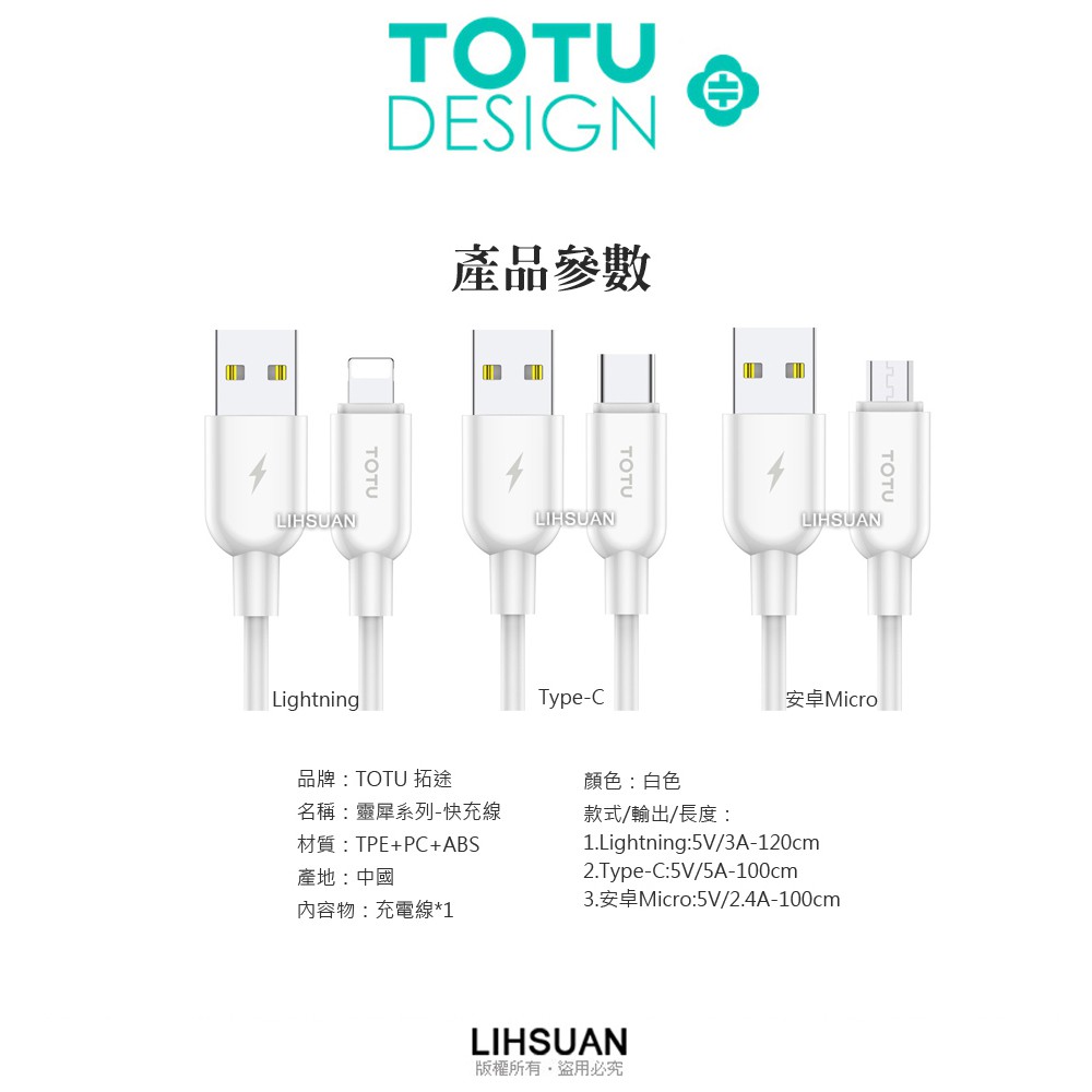 TOTU Type-C充電線傳輸線快充線數據線 5A快充 靈犀系列 100cm