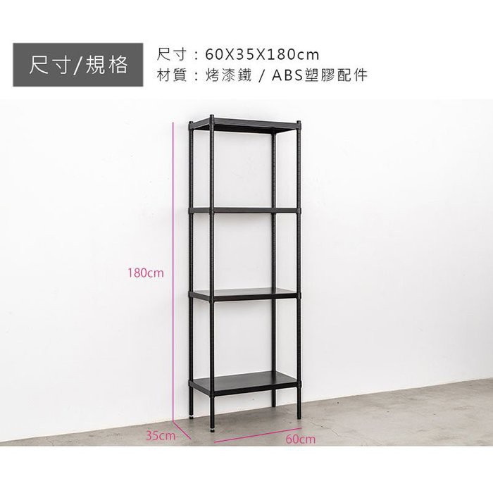 dayneeds 高強度鐵板四層收納層架60x35x180公分(烤漆黑)單層荷重200kg無洞鐵板層架 底部補強