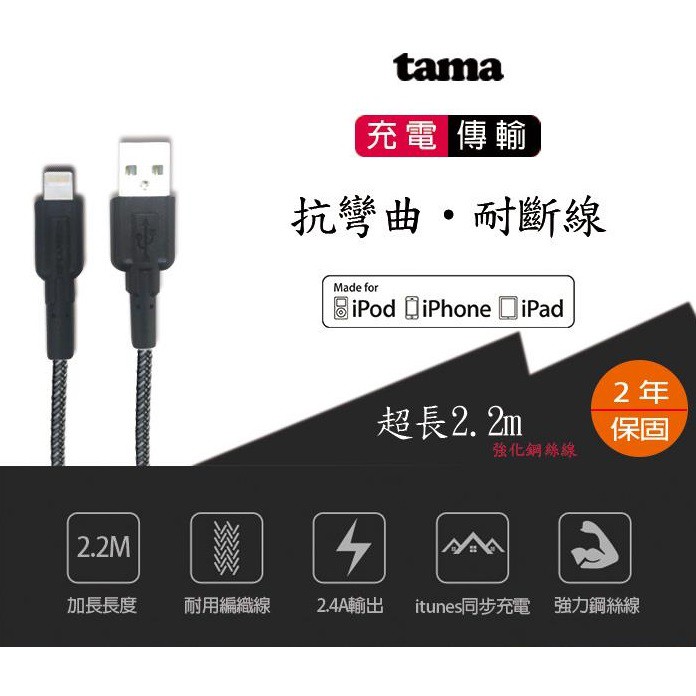 【tama's】Lightning 蘋果原廠MFi認證 超耐彎折充電線傳輸線 2.2米