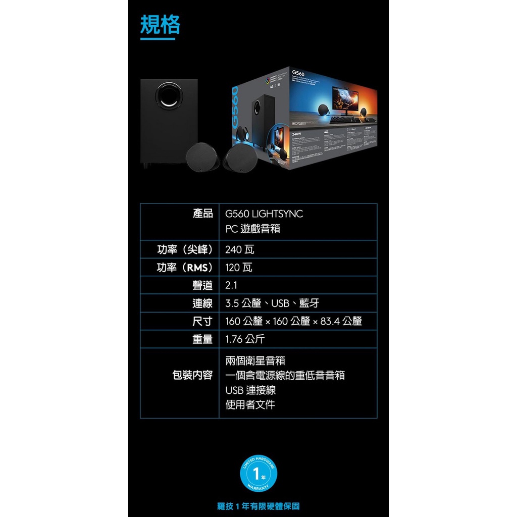 Logitech 羅技 G560 電競藍牙音箱系統 2.1 聲道 聲霸 喇叭 240W【現貨】【GAME休閒館】
