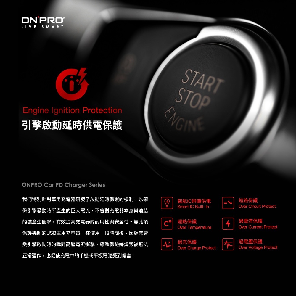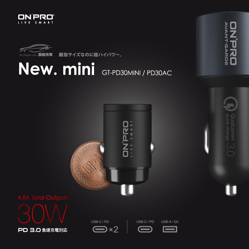 ONPRO GT-PD30AC 雙模式快充 PD30W+QC3.0 隱藏式迷你車用充電器