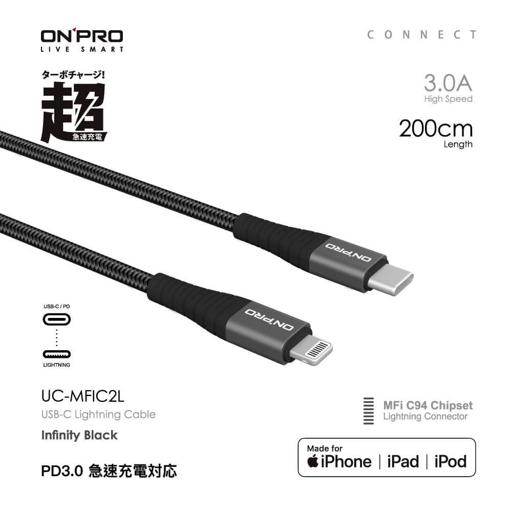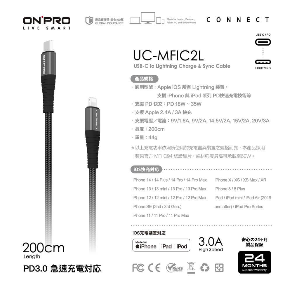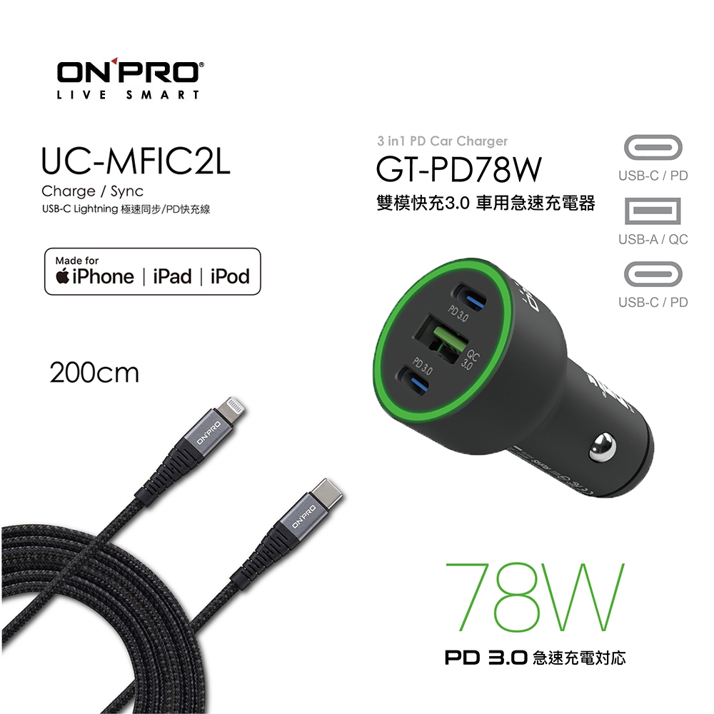 ONPRO GT-PD78W 3孔快充車充+UC-MFIC2L200線【iPhone車充+200公分線 車用快充組合】