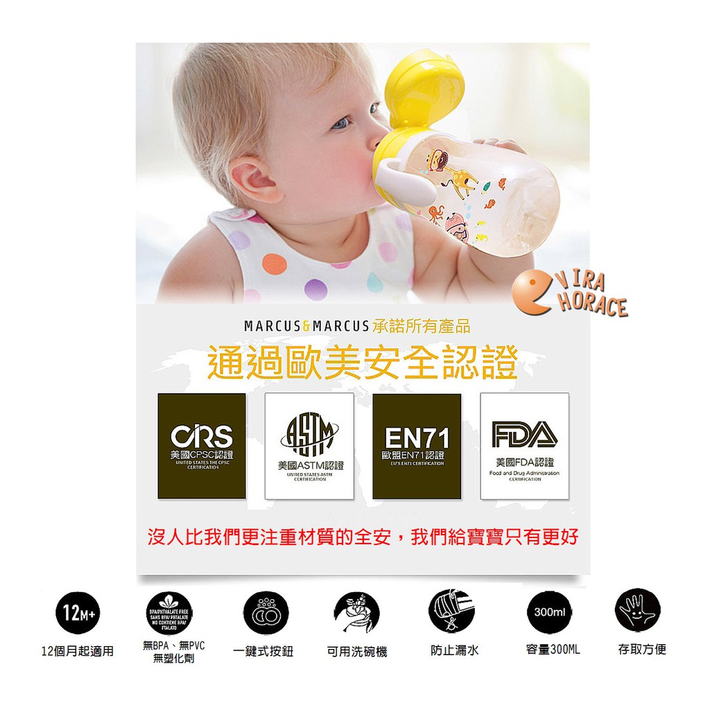 Marcus&Marcus 動物樂園Tritan吸管學習杯300ML 彈跳式按壓上蓋 可以單手快速補充水份 HORACE