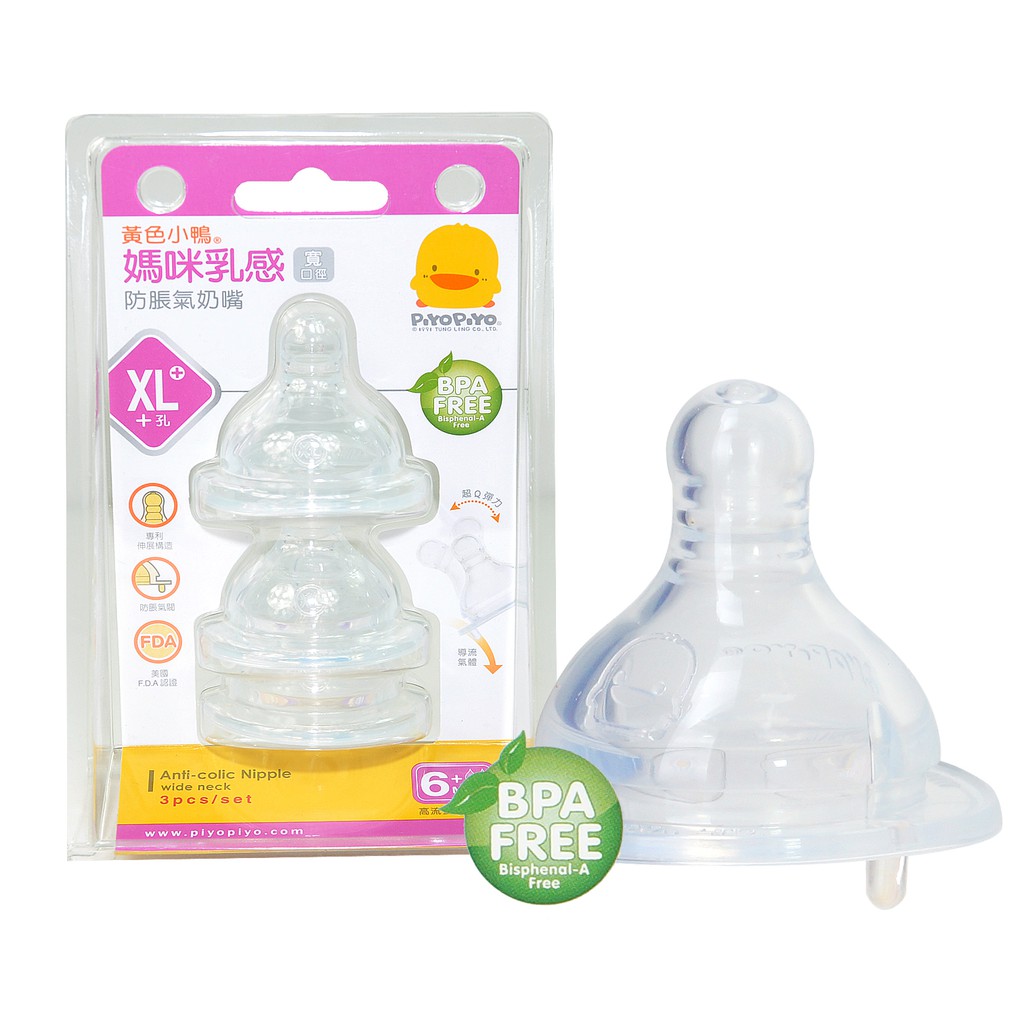 Piyo Piyo 黃色小鴨媽咪乳感寬口徑防脹氣奶嘴3入裝,讓親餵和瓶餵的轉換更順暢,減少乳頭混淆的困擾