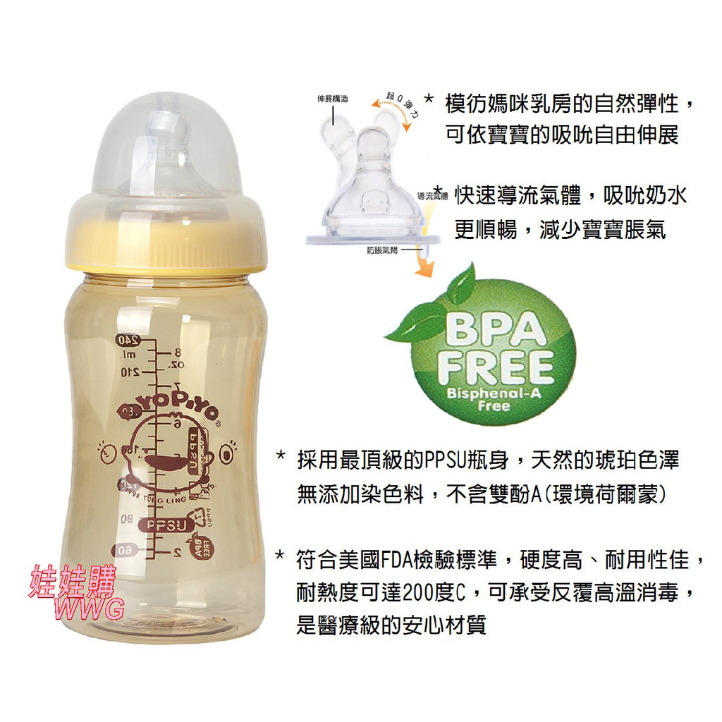 Piyo Piyo 黃色小鴨媽咪乳感PPSU葫蘆防脹氣奶瓶寬口徑奶瓶240ML,GT-83505