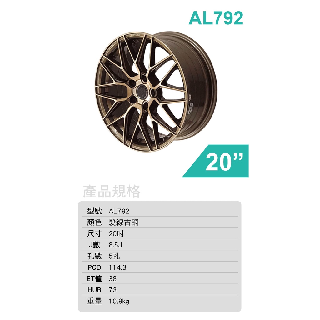 Alliance泓越 AVAS旋壓鋁圈輪框 AL792 20吋 5孔114.3/8.5J/ET38(髮線古銅)【真便宜】