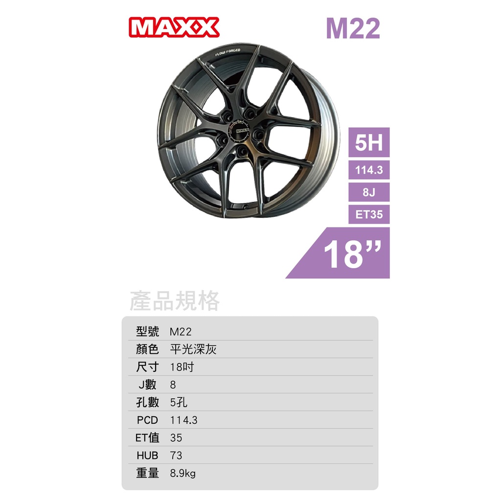 MAXX 旋壓鋁圈輪框 M22 18吋 5孔114.3/8J/ET35(平光深灰)【真便宜】