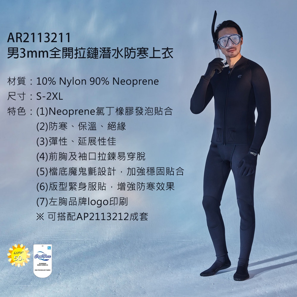 ADISI 男3mm全開拉鏈潛水防寒上衣AR2113211 / 浮潛 溯溪 水上活動 UPF50+ 防曬 防磨 防水母