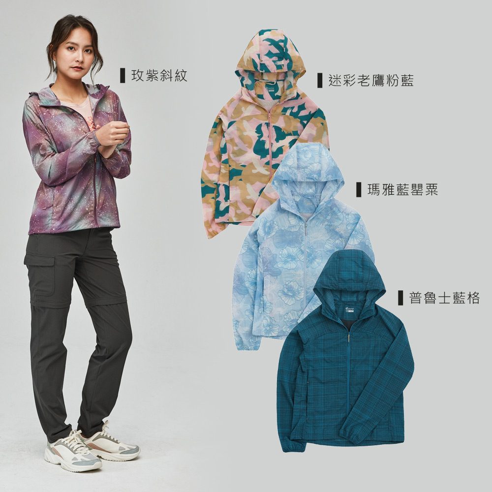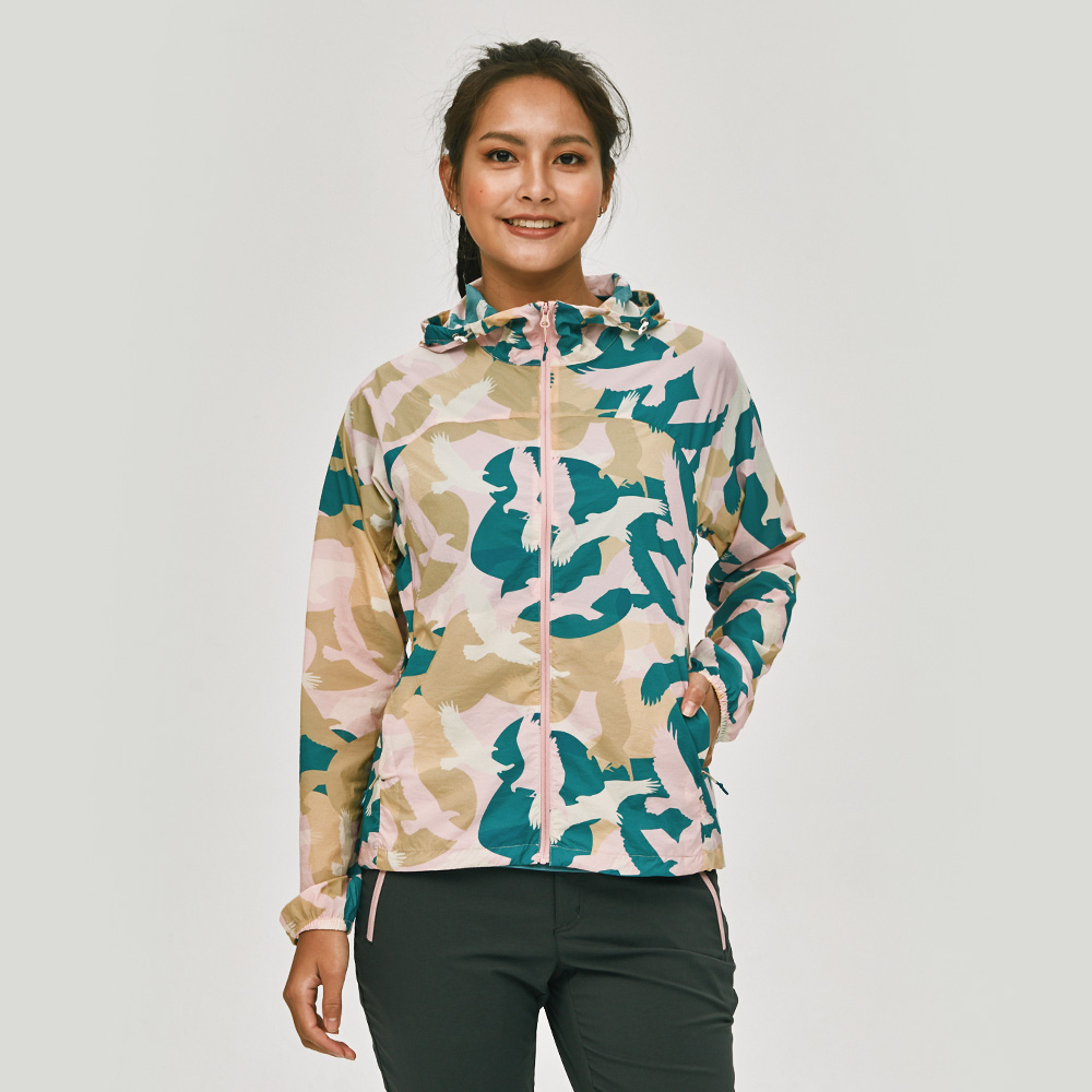 ADISI 女輕肌感彈透印花抗風撥水連帽外套AJ2391055 (S-2XL) 迷彩老鷹粉藍|輕薄透氣 輕抗風 輕撥水