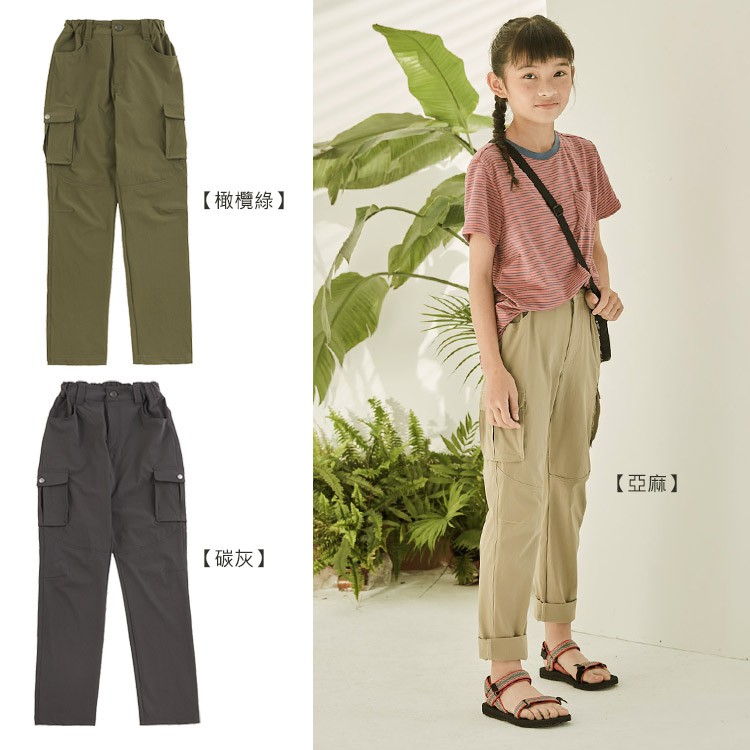ADISI 童彈性快乾兩側立體袋休閒長褲AP2111006 橄欖綠 / 四面彈 排汗速乾 輕薄透氣 休閒褲