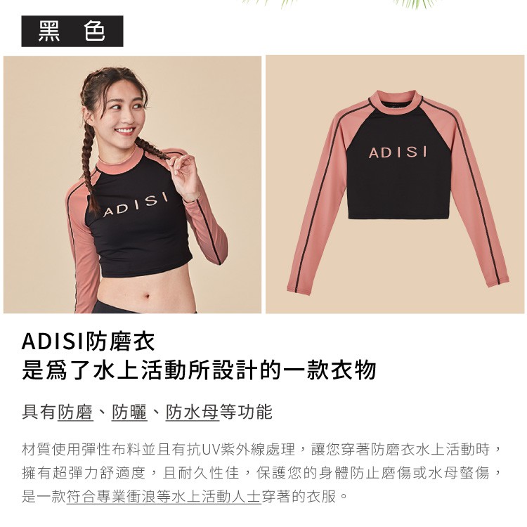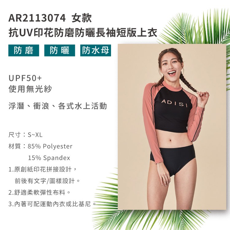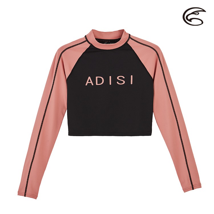 ADISI 女抗UV印花防磨防曬長袖短版上衣 AR2113074 黑色|防磨衣 水母衣 溯溪 浮潛 衝浪 泳衣 泳裝