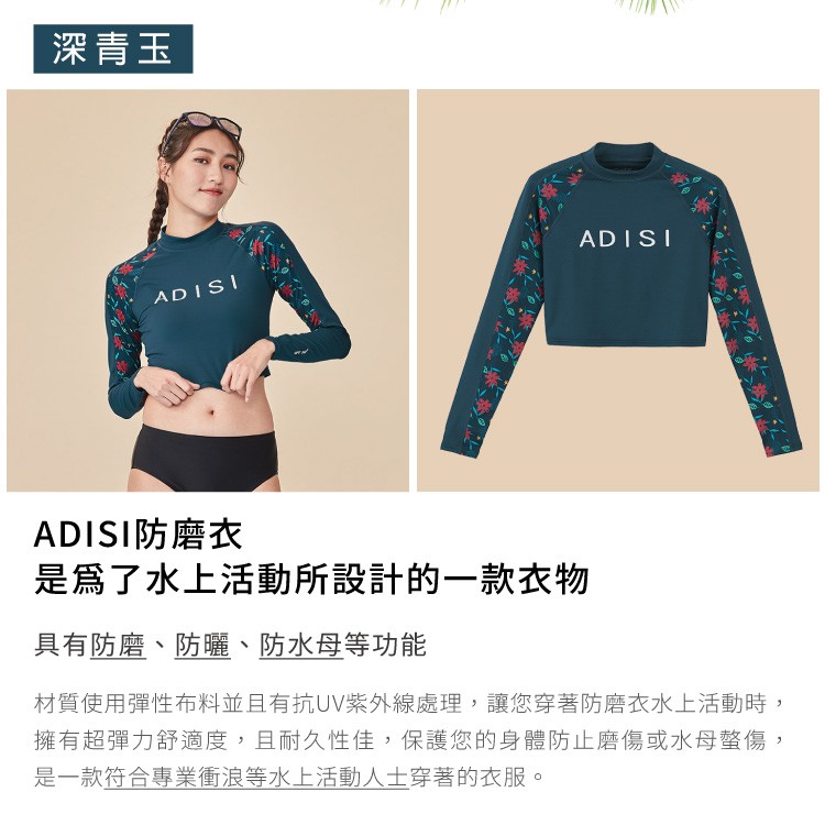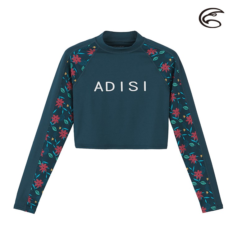 ADISI 女抗UV印花防磨防曬長袖短版上衣 AR2113074 深青玉|防磨衣 水母衣 溯溪 浮潛 衝浪 泳衣