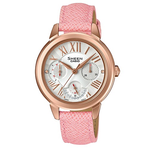 【CASIO】SHEEN 輕熟女優雅時尚真皮腕錶-粉X白面(SHE-3059PGL-7A)正版宏崑公司貨