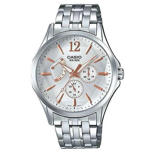 【CASIO】六芒星閃耀不鏽鋼紳士錶-白X蜜桃金(MTP-E120DY-7A)正版宏崑公司貨