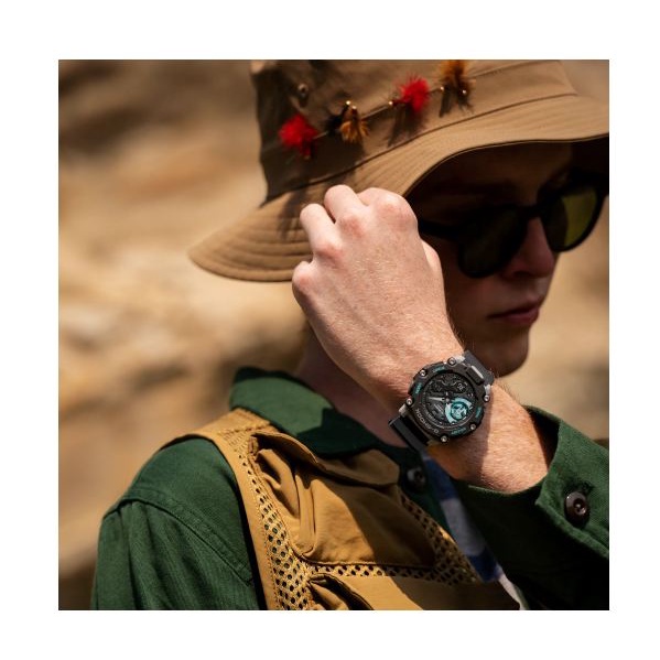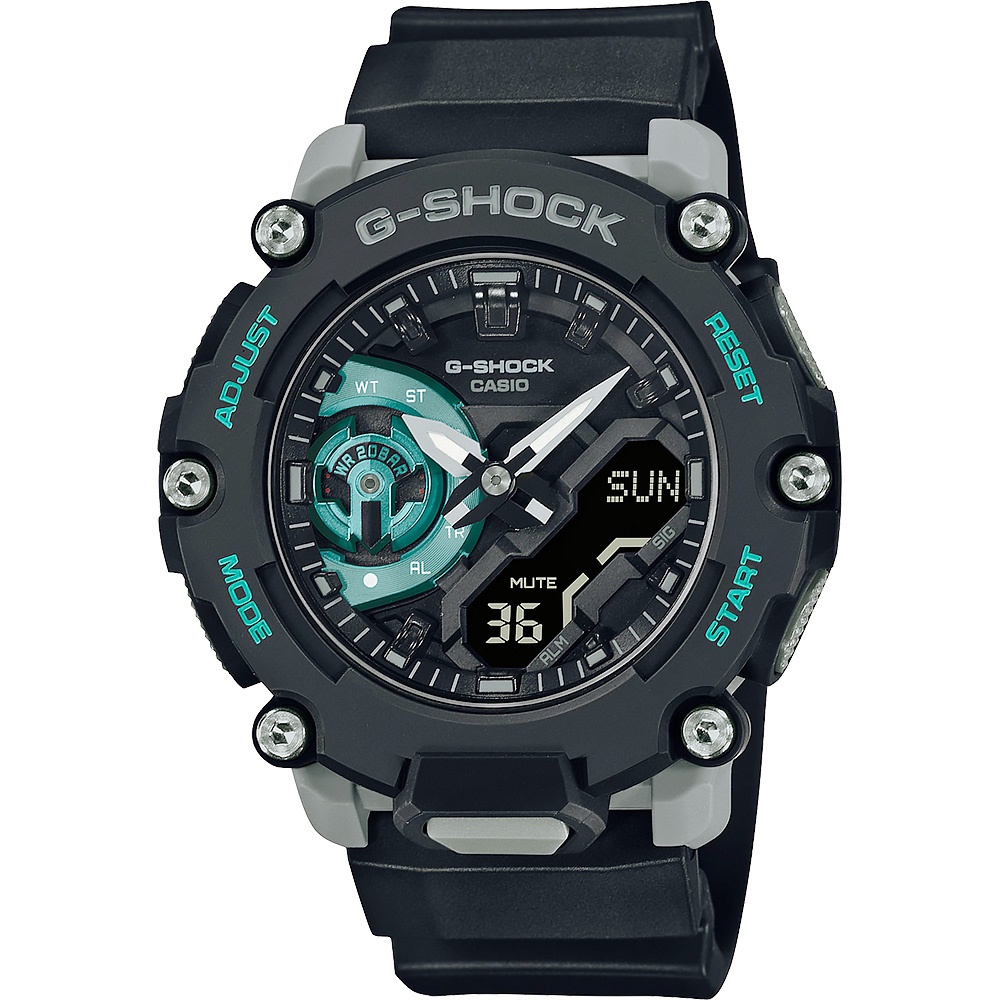 【CASIO】G-SHOCK 碳核心防護構造汽車煞車碟盤設計戶外冒險運動錶-黑X藍綠配色(GA-2200M-1)公司貨