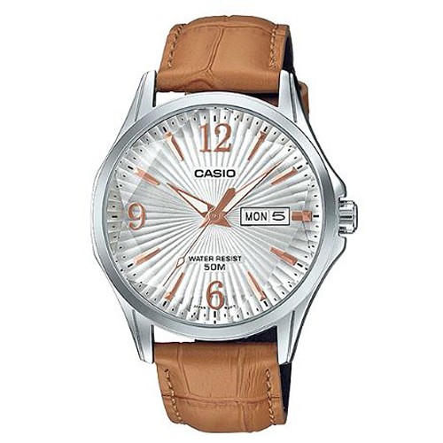 【CASIO】六芒星閃耀皮帶紳士錶-銀白X玫瑰金(MTP-E120LY-7A)正版宏崑公司貨