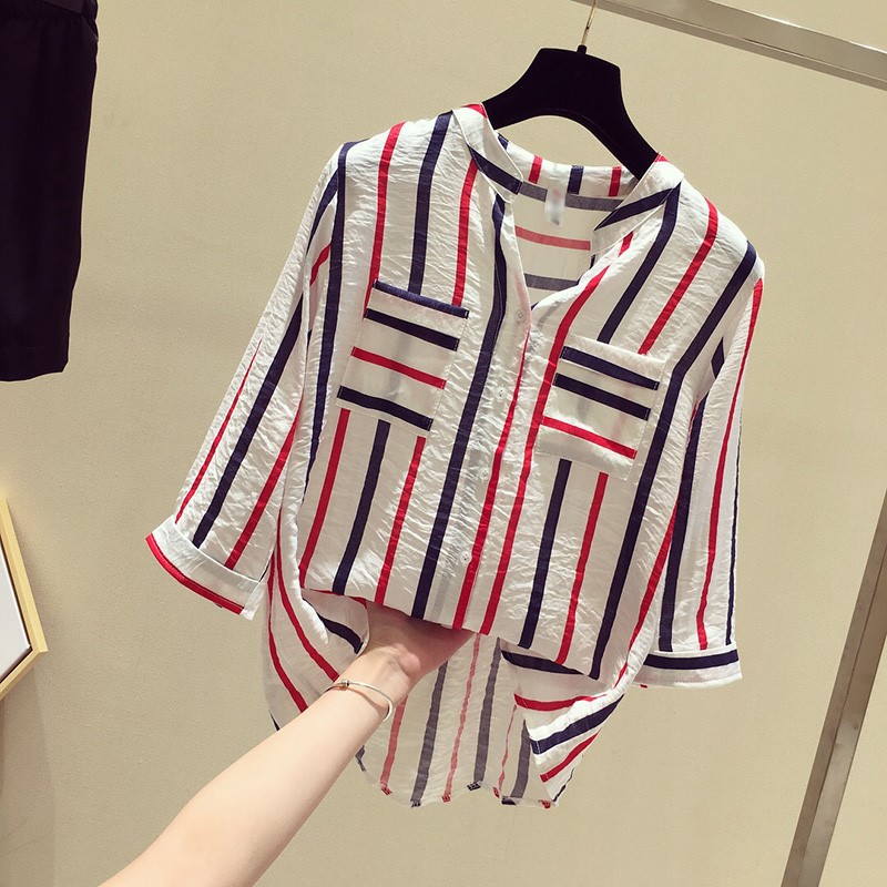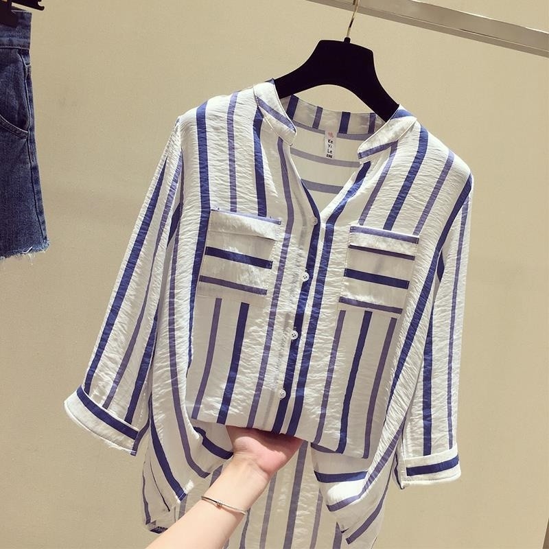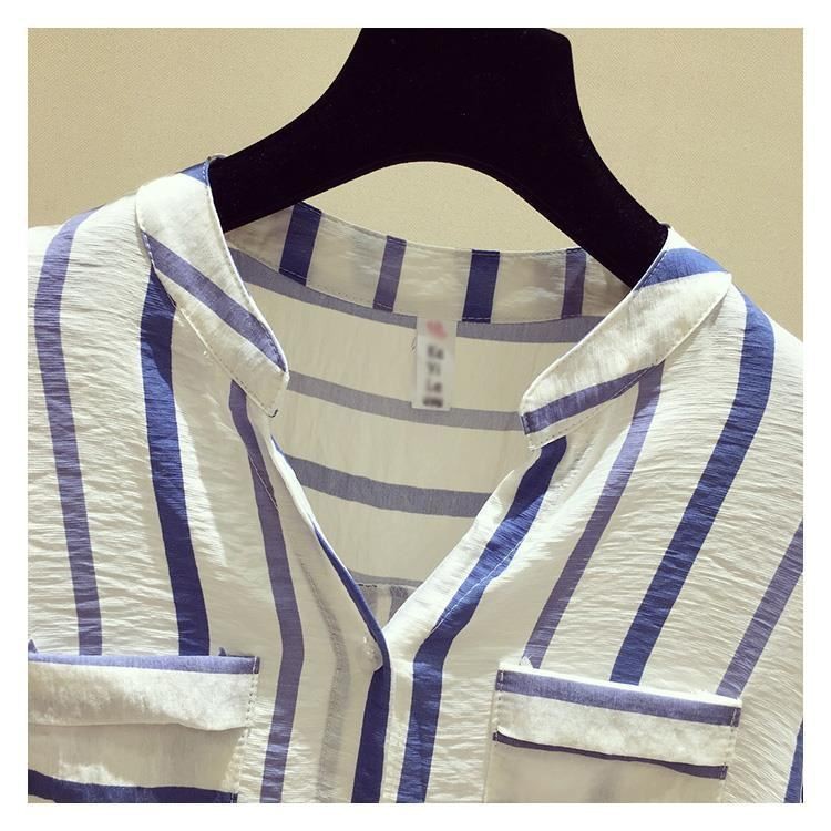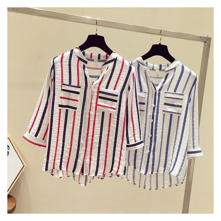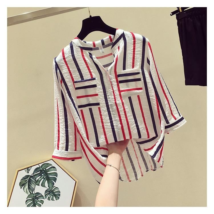 ZUCAS - 豎條紋襯衫寬鬆七分袖V領雪紡襯衫 - XA-6719