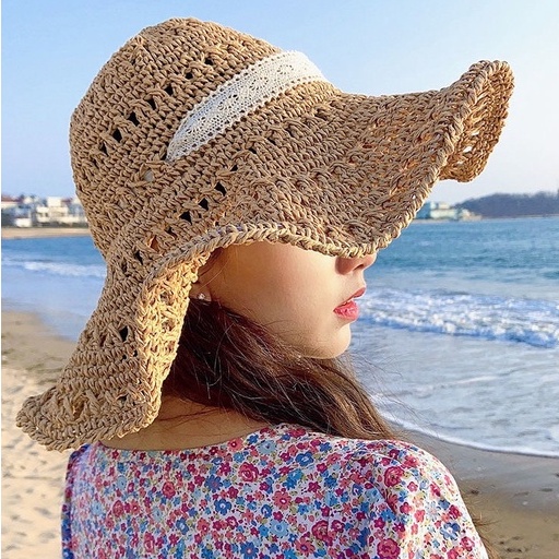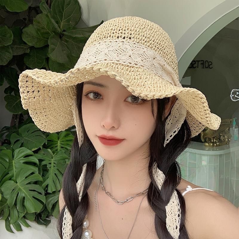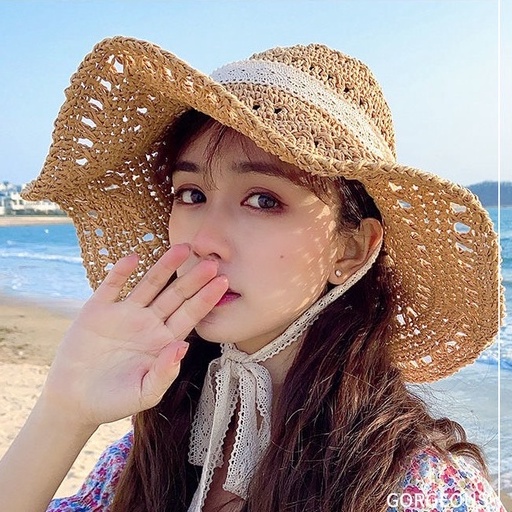 ZUCAS - 韓國蕾絲繫帶大沿草帽遮陽帽摺疊沙灘帽 - SH-4602