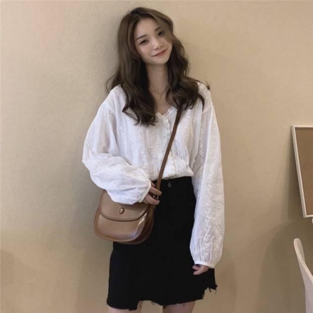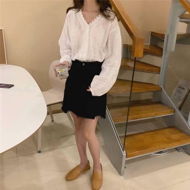 ZUCA”S~(現貨)氣質燈籠袖白色花邊大V領短袖襯衫 - HL-426