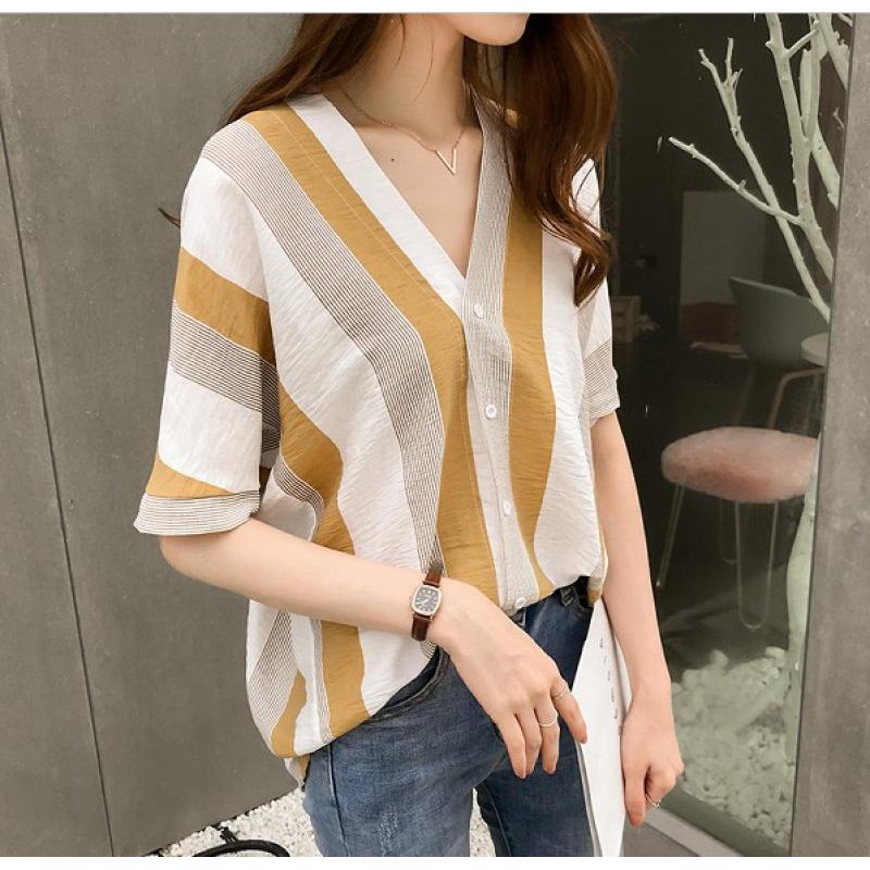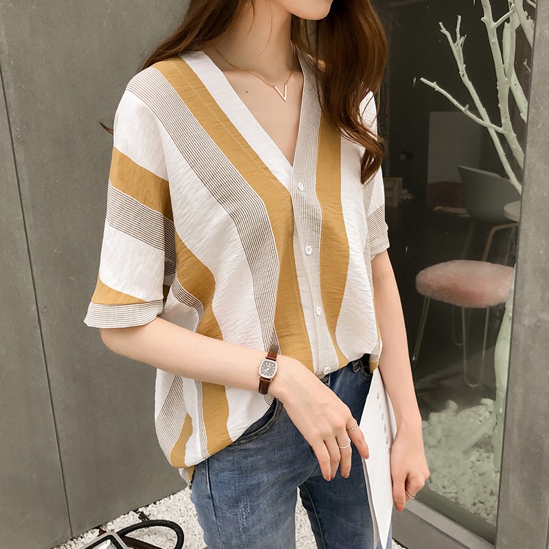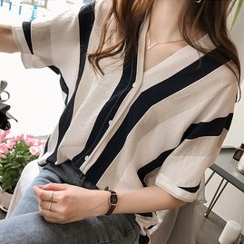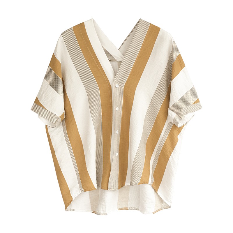 ZUCAS~(現貨)直條配色雙V領排釦棉麻上衣 - QW-3203