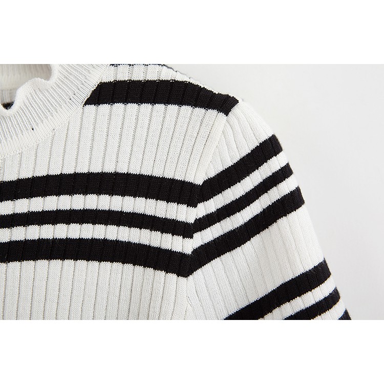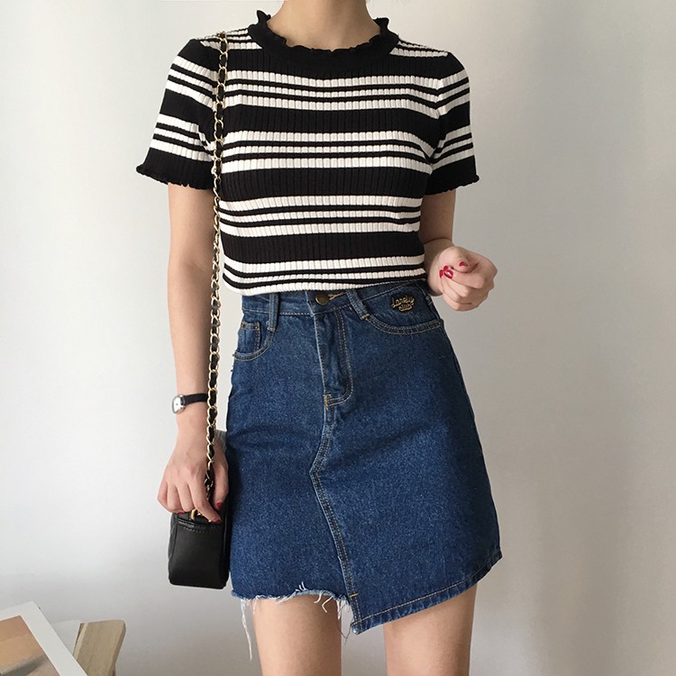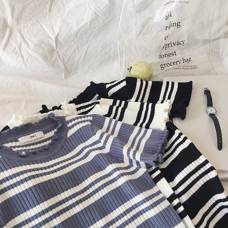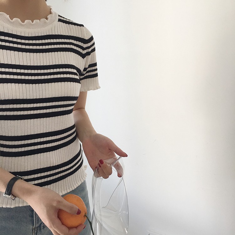 ZUCA”S - 撞色條紋花邊領彈力緊身短款針織短袖T恤 - T-6477