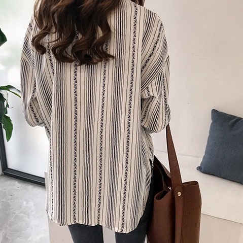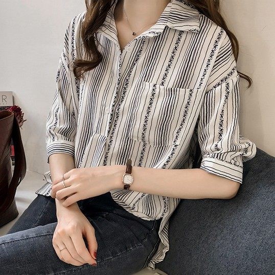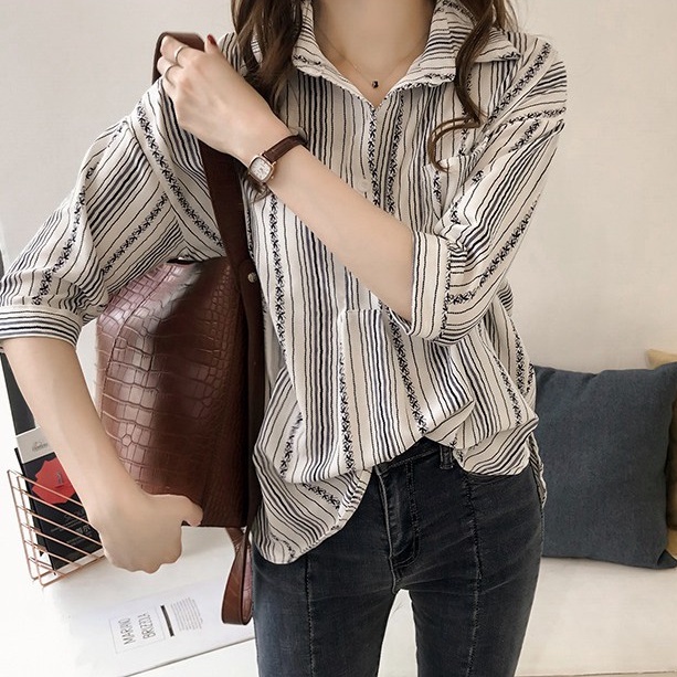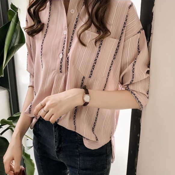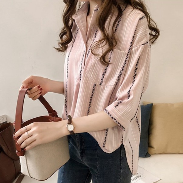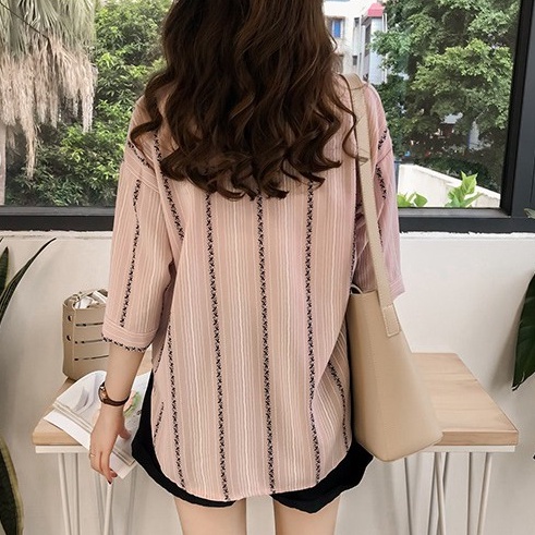 ZUCA”S - 直條紋小花雪紡V領七分袖襯衫 -GU-8569