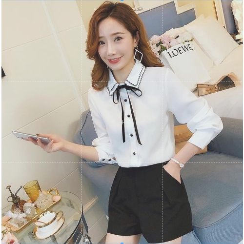 ZUCA”S - 花邊領蝴蝶結綁帶長袖雪紡襯衫 - GU-1129