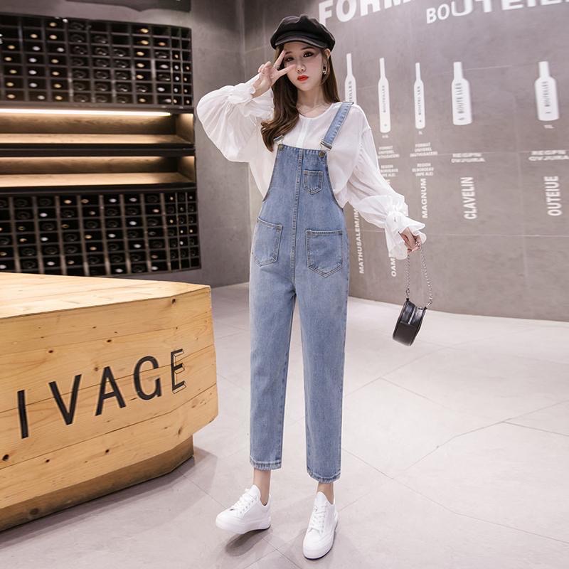ZUCA”S - 韓版休閒百搭簡單森林系丹寧牛仔口袋刷破設計吊帶直筒高腰花苞牛仔吊帶褲 - A-247